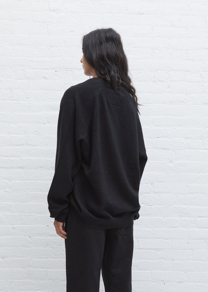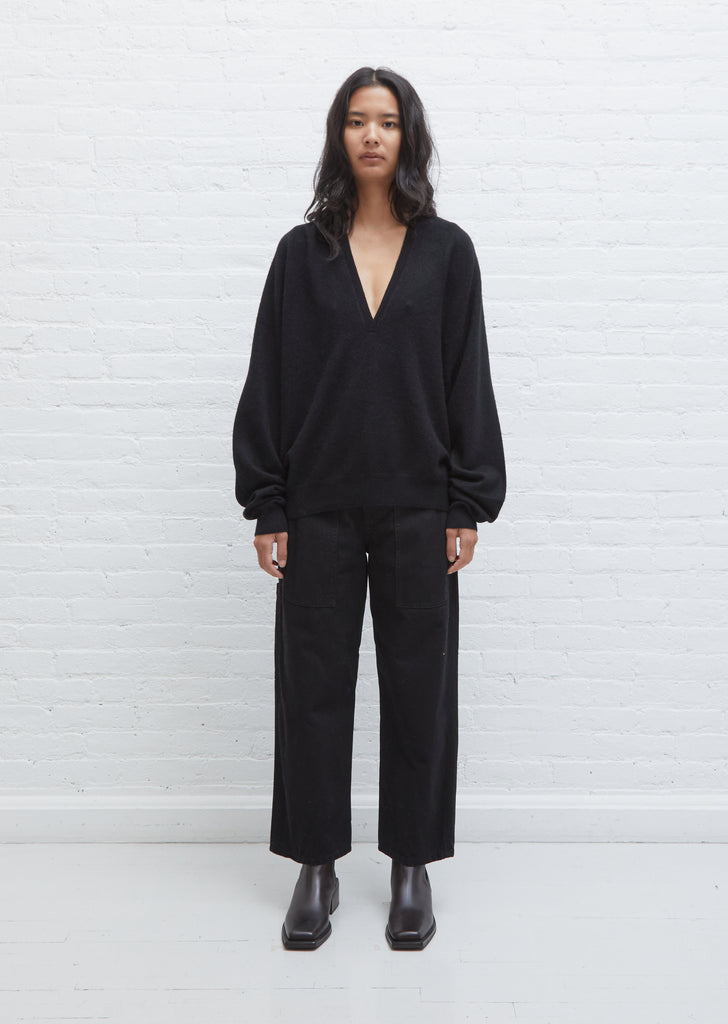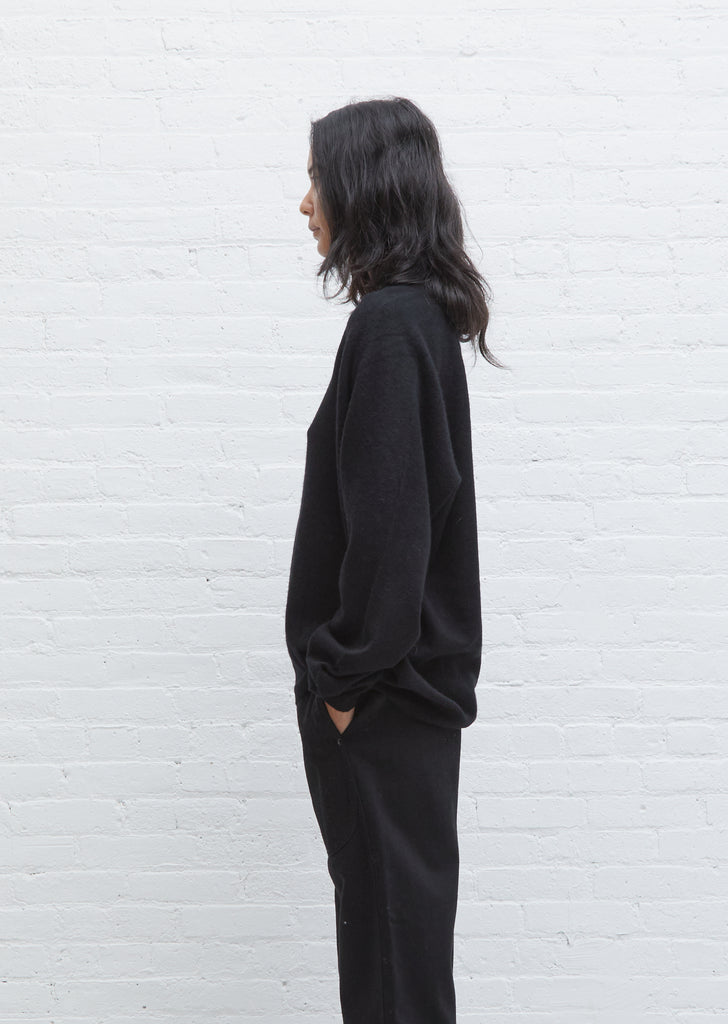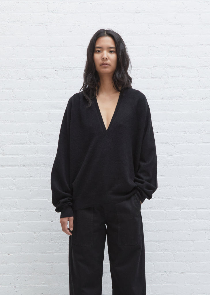 Black deep V-neck sweater with a boyfriend fit in cashmere from Swiss knitwear label Frenckenberger. Features a slim rib trim at neckline and wider rib sleeve cuffs and hem. Oversized, slightly blouson fit.