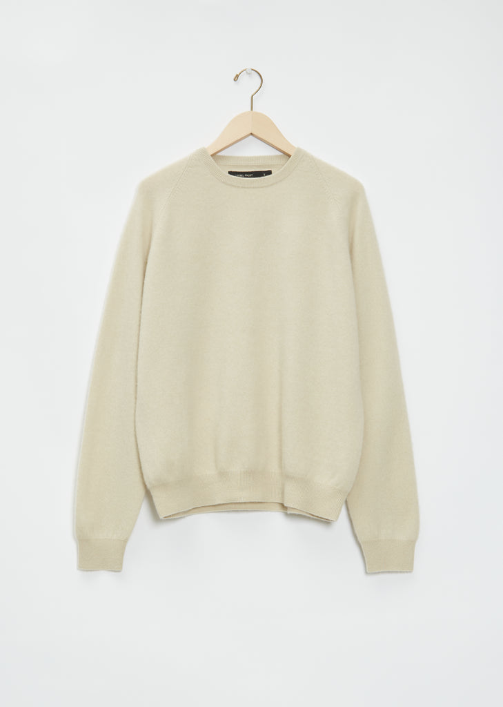 Frenckenberger unisex chalk-toned crewneck boyfriend-style sweater with raglan sleeves in an ultra-soft cashmere knit.