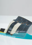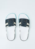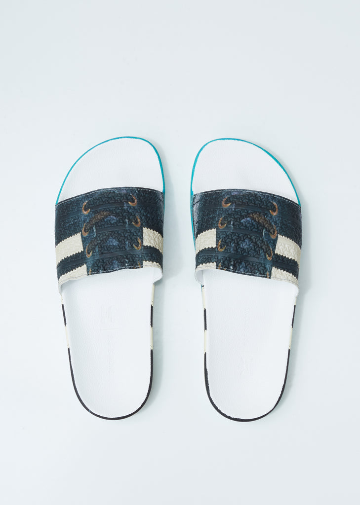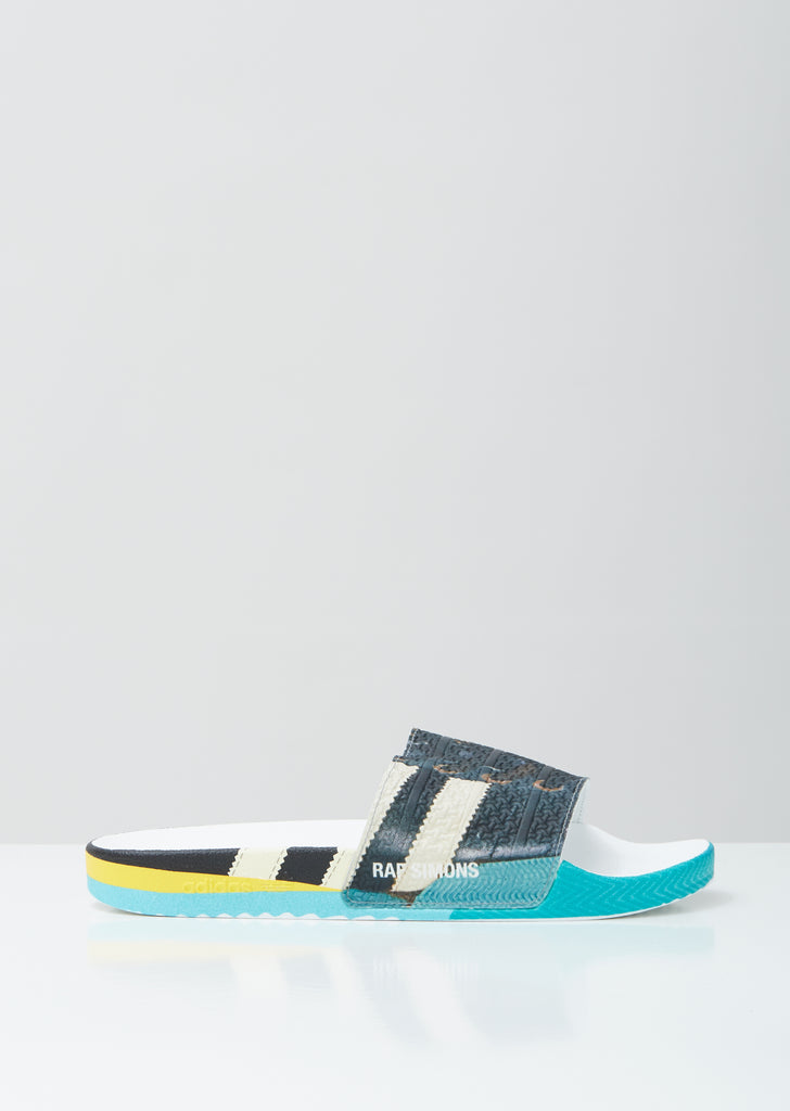 Raf Simons's latest take on the minimalist, '70s-era Adidas Adilette slide. This rubber slip-on style features a 3-D trompe l'oeil print of Samba laces on the upper strap. Round toe. Contoured footbed. Multicolored sole. Raf Simons logo on strap. Partial Adidas three-stripe logo on strap and sole. Color: Cblack/ftwwht/brblue. Synthetic. Imported.