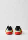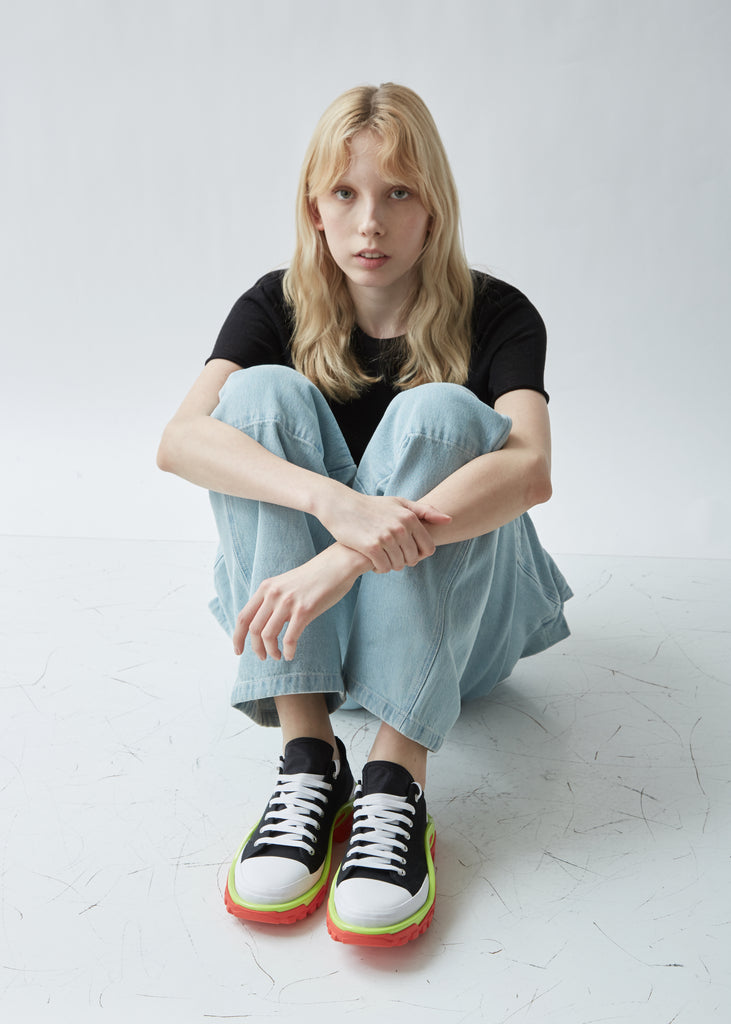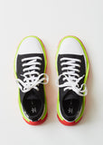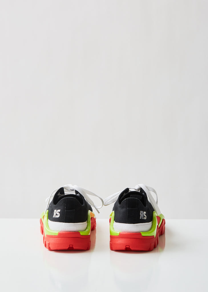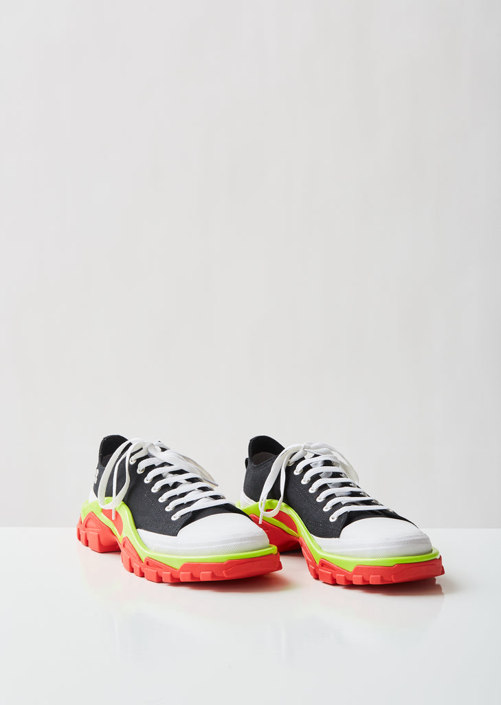 Raf Simons x adidas RS Detroit Runner sneakers in black canvas, with contrasting neon green and pink soles. Low top style with white rubber toe caps. Flat white cotton laces. RS silver logo appliqué at the sides. Cushioned insole. Performance-inspired rubber soles with slight elevation. 1" platform. Color: Cblack/silvmt/sslime. Cotton, Rubber. Imported.