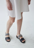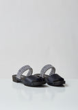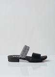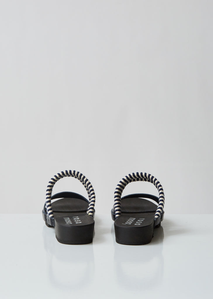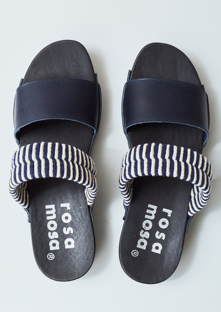 Handmade Bobo sandals in striped navy cotton and vegetable tanned leather. Classic two-strap design with an artisanal finish. Beige wooden soles with low stacked heels. Silver-tone staples along the midsole. Textured rubber soles. 2" heel. Color: Navy/Navy. Uppers: Leather, cotton; Soles: Leather, wood, rubber. Imported.