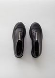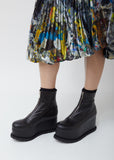Zip-front black calfskin ankle boots designed with a thick, self-covered platform midsole. Step-in style. Round toe. Zip-up vamp. Polished silvertone-metal hardware. Lugged rubber outsole.