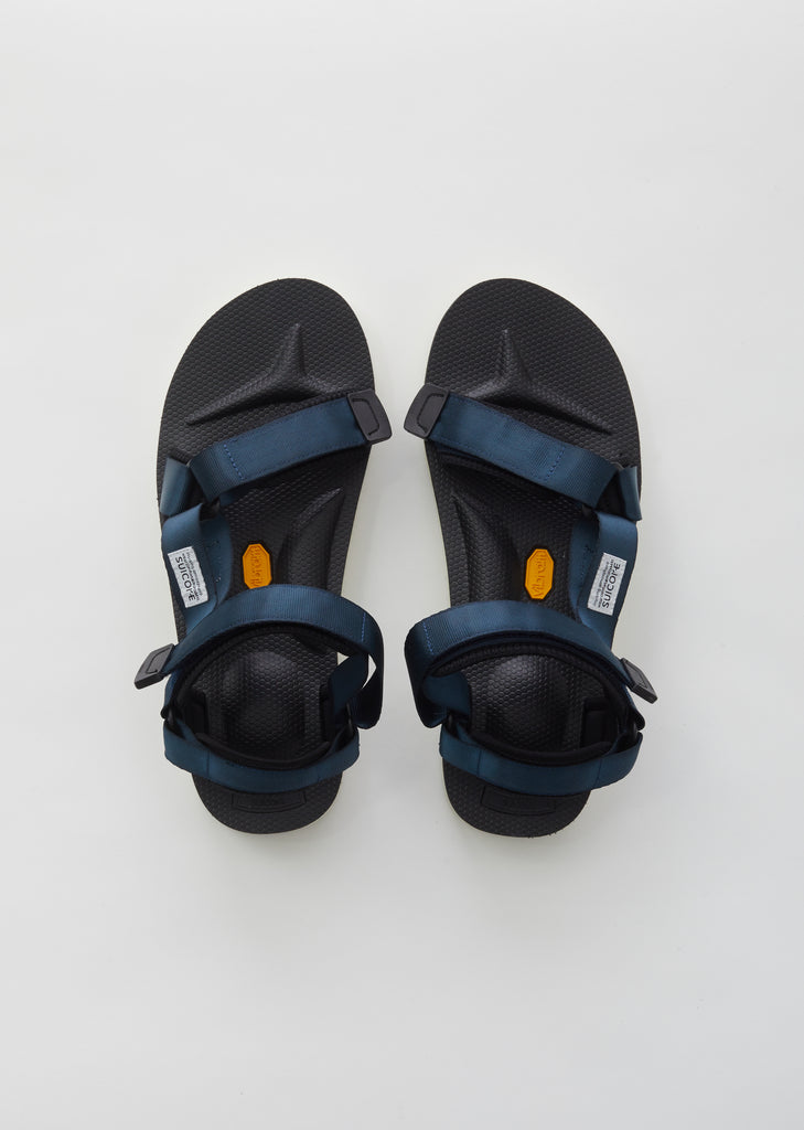 Open-toe Velcro-strap sandals in navy webbing with black neoprene backing. This summery style includes a Vibram footbed and sole for all-day comfort.