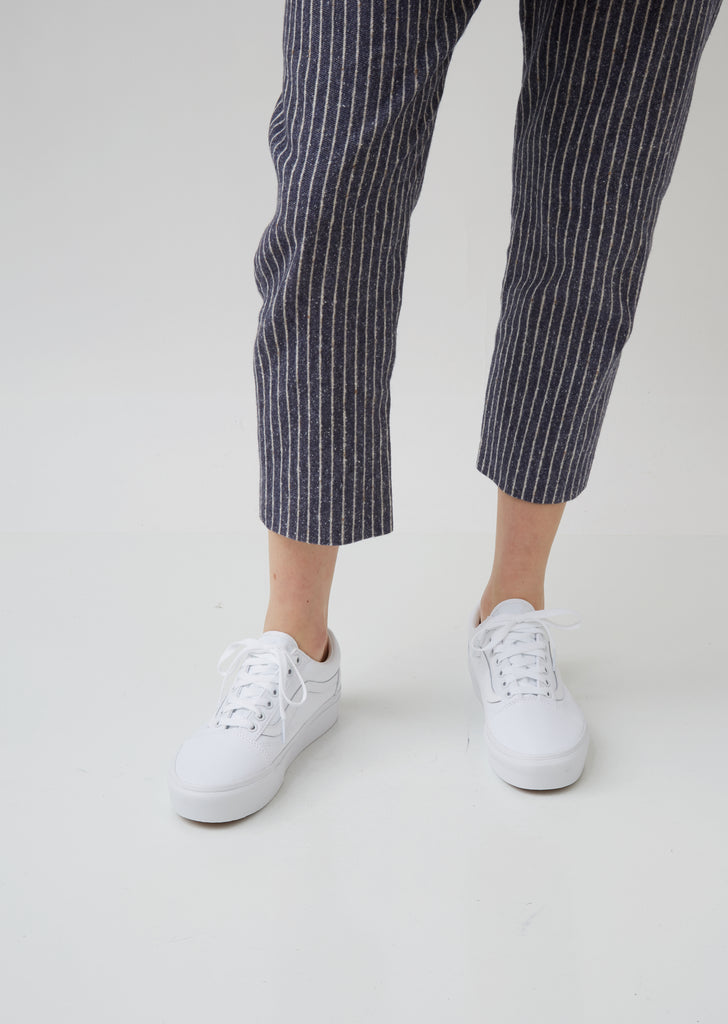 White old skool platform skate shoe with sturdy canvas and suede uppers. Re-enforced toecaps, padded collars for support and flexibility, and platform signature rubber waffle outsoles. Color: True White. Suede, Canvas. Imported.