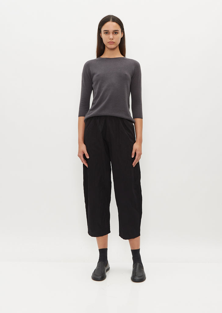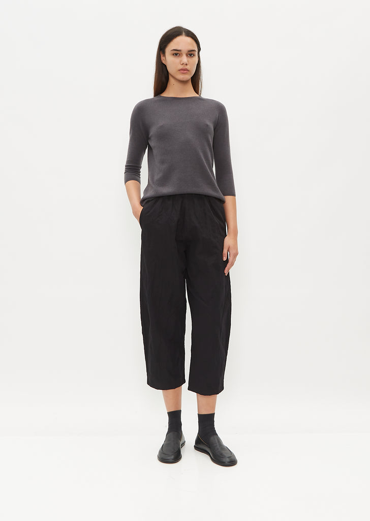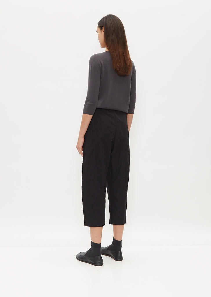 Apuntob black balloon shaped cropped trouser in washed cotton with metallic threading. Features an elasticized waist and angled side pockets. Unlined. Pulls on.