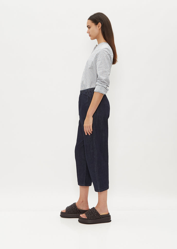 Apuntob indigo balloon shaped cropped trouser in washed cotton. Features an elasticized waist and angled side pockets. Unlined. Pulls on.