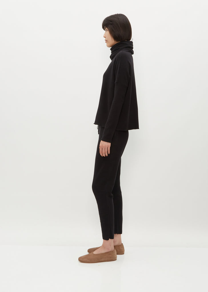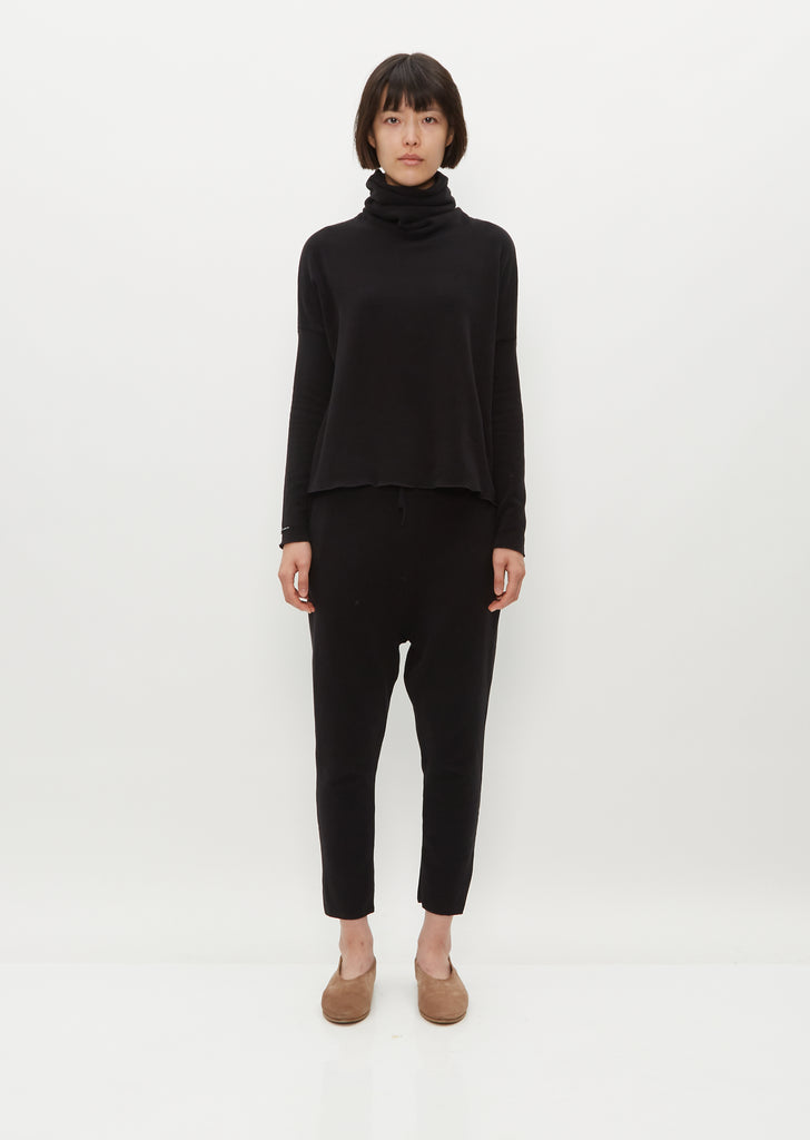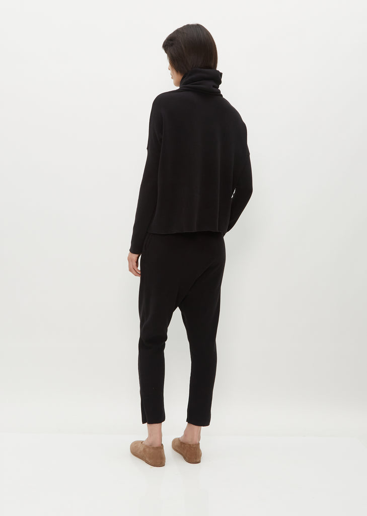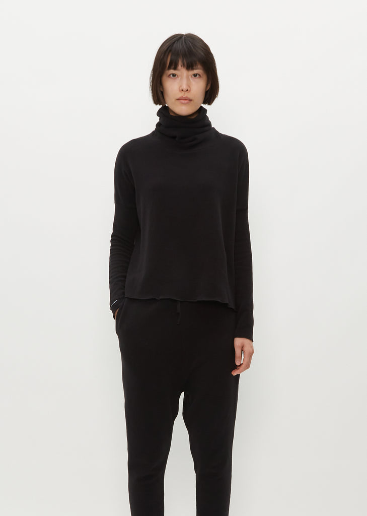 Album di Famiglia black roll-over turtleneck with a dropped shoulder in a soft cotton acrylic fleece blend. Features a relaxed, straight silhouette and a chunky roll-over turtleneck.