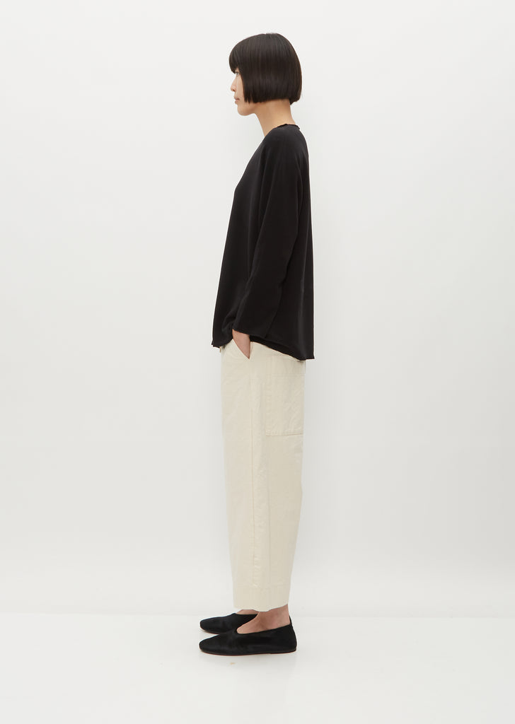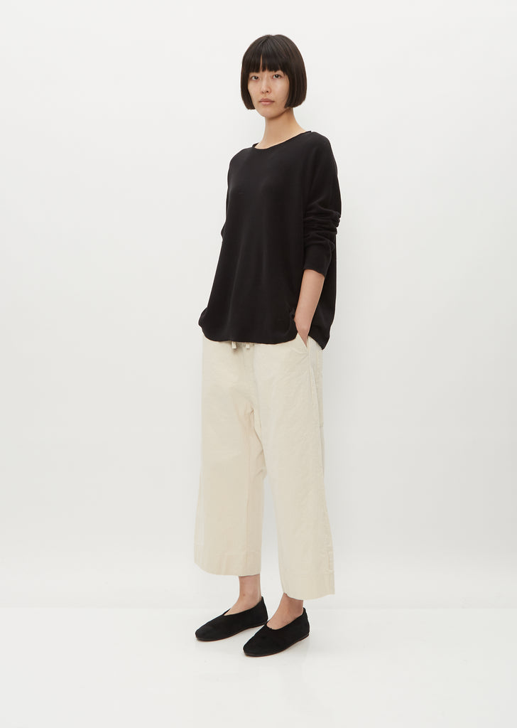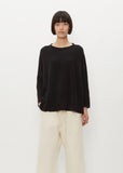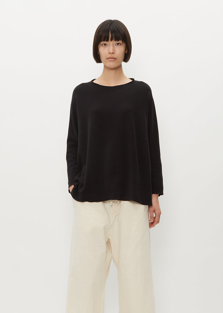 Album di Famiglia black signature basic pullover in a soft, plush jersey with a hint of stretch for comfort, and exposed reverse seam detailing at side seams. Features an open neckline, a loose fit and signature slim sleeves. Finished with marrow stitched edges.