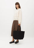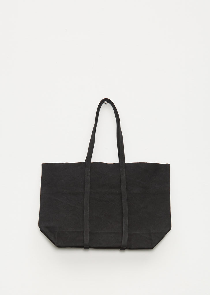 Amiacalva black medium 6-pocket tote bag with three exterior and interior slip pockets in a pre-washed heavyweight cotton canvas. Dual top handles. Three exterior and interior pockets. Gusseted base. Branded leather patch at interior pocket. Unlined.