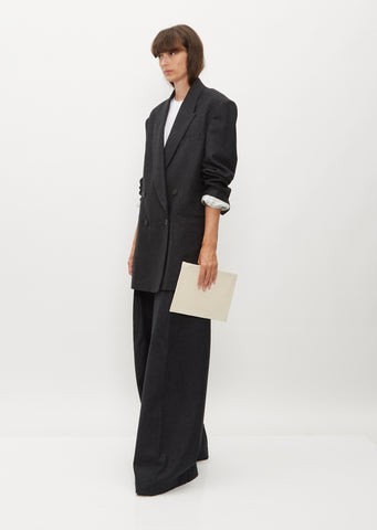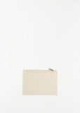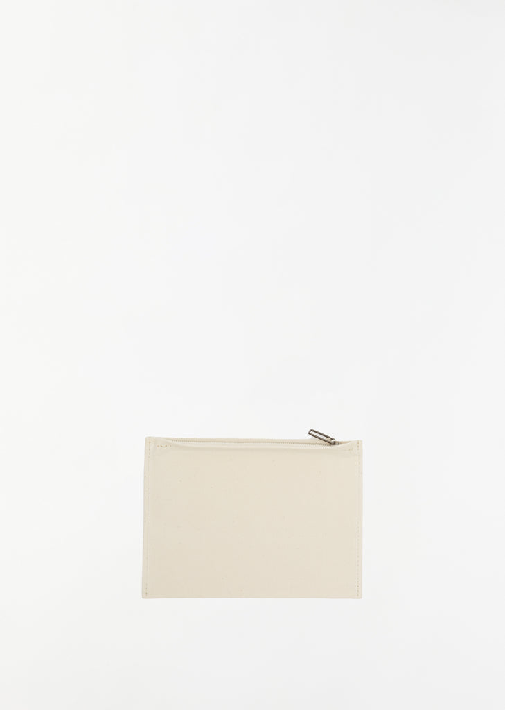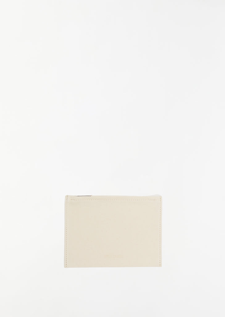 Amiacalva white large zipper pouch with stamped brand logo and topstitching detail in a washed cotton canvas. Ivory zipper with silver toned pull at top opening. Unlined.