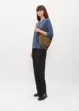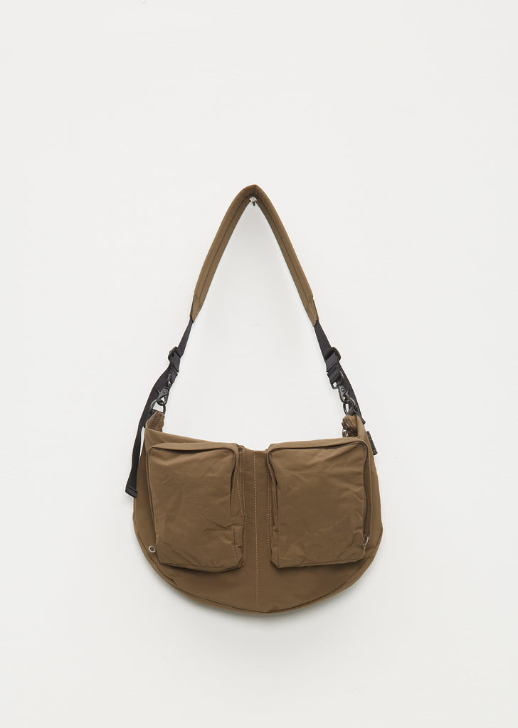 Amiacalva khaki tech-gabardine travel-minded bag designed to be worn comfortably across the back. Demi-lune silhouette. Two-way zip-top closure. Two zip-around patch pockets at face. Folded logo-debossed leather tag at side seam. Adjustable, detachable nylon-webbing crossbody/shoulder strap with slide buckles; lobster-clasp/ring fastening. Tonal coated-metal hardware. Large interior slip pocket with Velcro closure. Two small interior slip pockets. Logo-debossed leather patch at main compartment. Tonal leather and top-stitching details throughout.