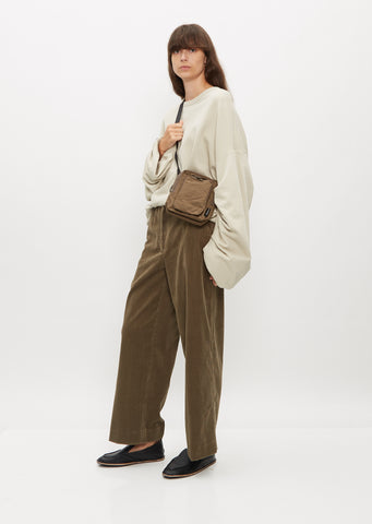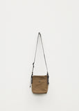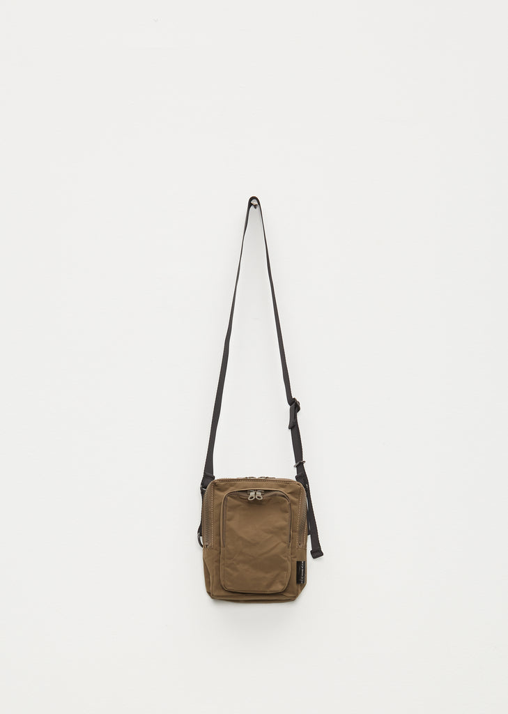 Amiacalva small, flat multi-pocket crossbody bag in durable khaki tech-gabardine. One large zip compartment. Exterior zip pocket. Folded logo-debossed leather tag at side seam. Flat adjustable nylon-webbing crossbody/shoulder strap with slide buckles. Single interior compartment with logo-debossed leather patch. Single exterior slip pocket; press-stud closure. Tonal coated-metal hardware. Tonal leather and top-stitching details throughout.
