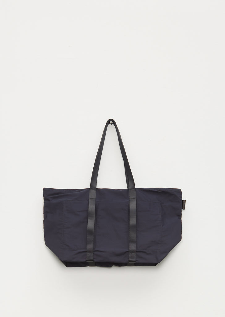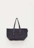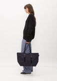 Amiacalva signature ultralight tote bag in technical polyester gabardine in navy, Exclusive color for La Garçonne, with tonal double webbing shoulder straps. Features two roomy interior pockets with velcro closure and three additional small open pockets. Flap tote with side gussets. Two-way zip top closure. Tonal hardware.