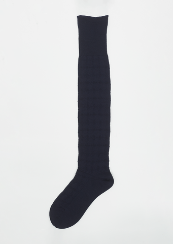 Antipast navy knee high socks with a diamond link jacquard pattern knit in a wool blend.
