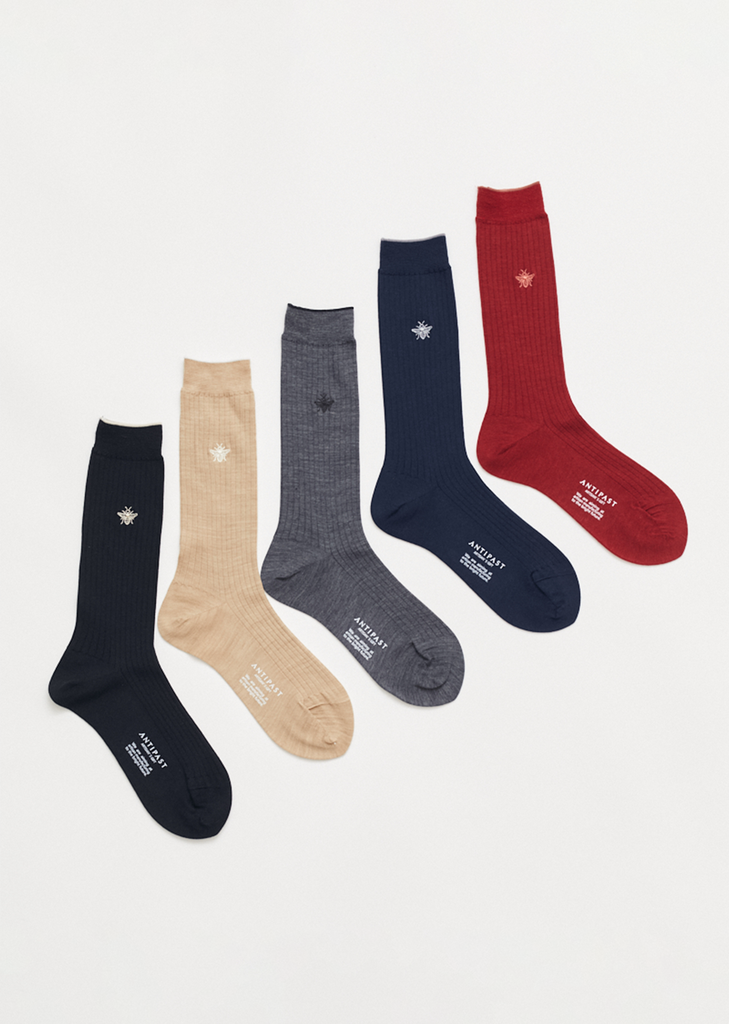 Antipast medium grey crew sock with an embroidered bee at top knitted in a ribbed merino wool blend.