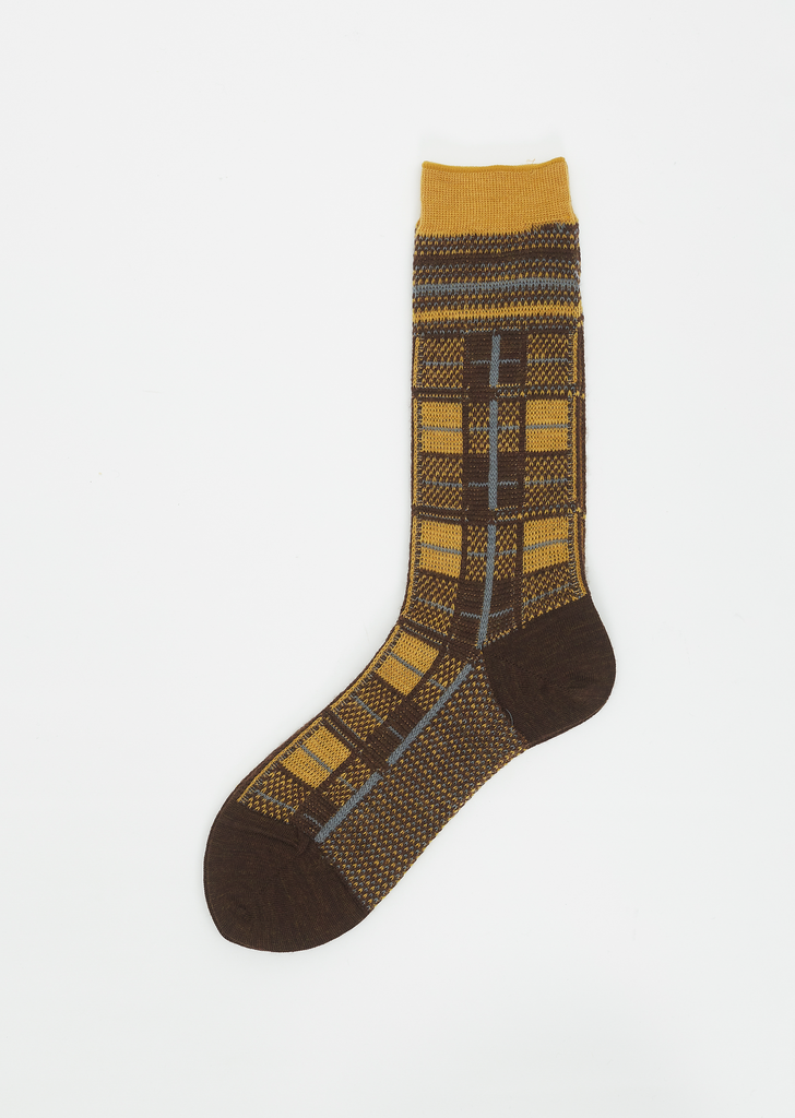 Antipast brown, yellow and grey tartan checked knee high socks knit in a wool blend.