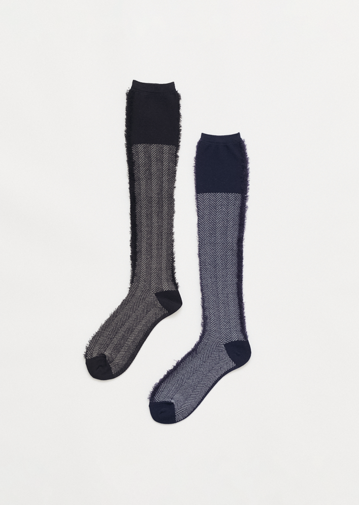 Antipast navy knee high socks with a wide solid top and herringbone print with fringe along the sides knit in an acrylic nylon blend with a touch of wool.
