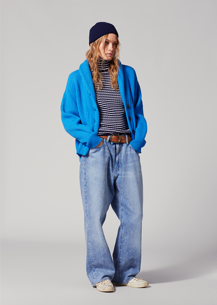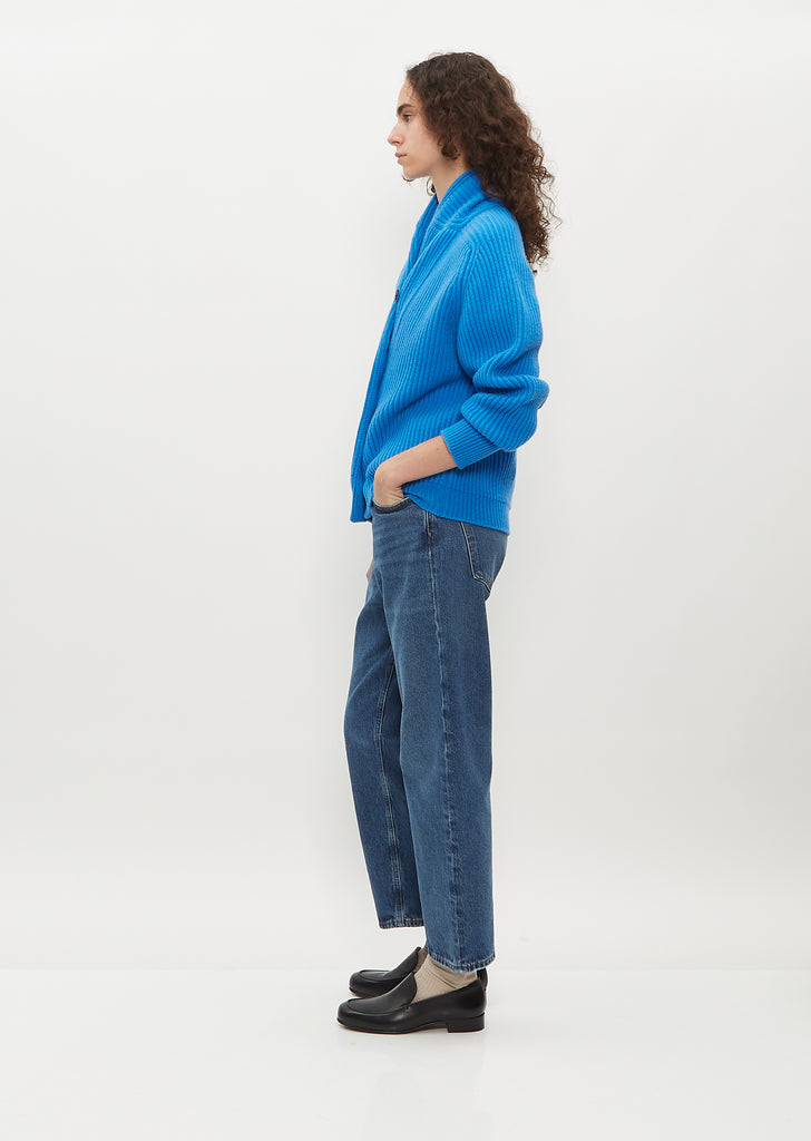 Begg x Co norse blue slightly cropped cardigan with a classic fisherman-style button front closure and shawl collar knitted in mid-gauge with chunky ribbed cashmere. Straight silhouette with a relaxed fit.