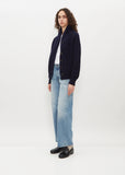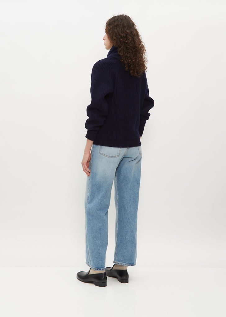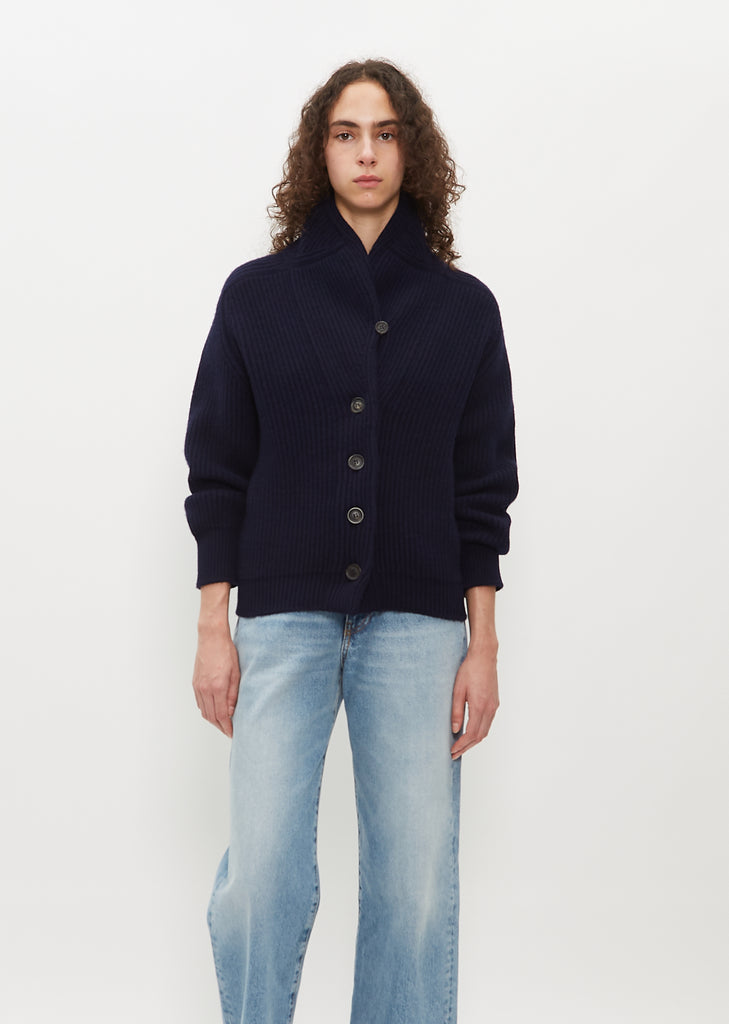 Begg x Co navy blue slightly cropped cardigan with a classic fisherman-style button front closure and shawl collar knitted in mid-gauge with chunky ribbed cashmere. Straight silhouette with a relaxed fit.