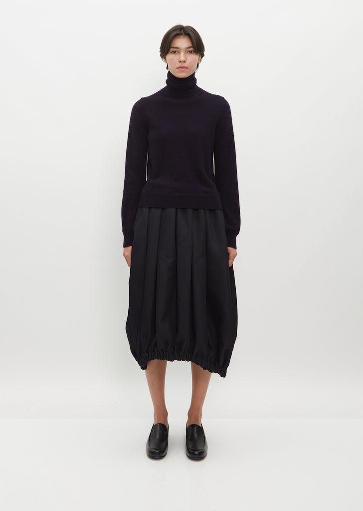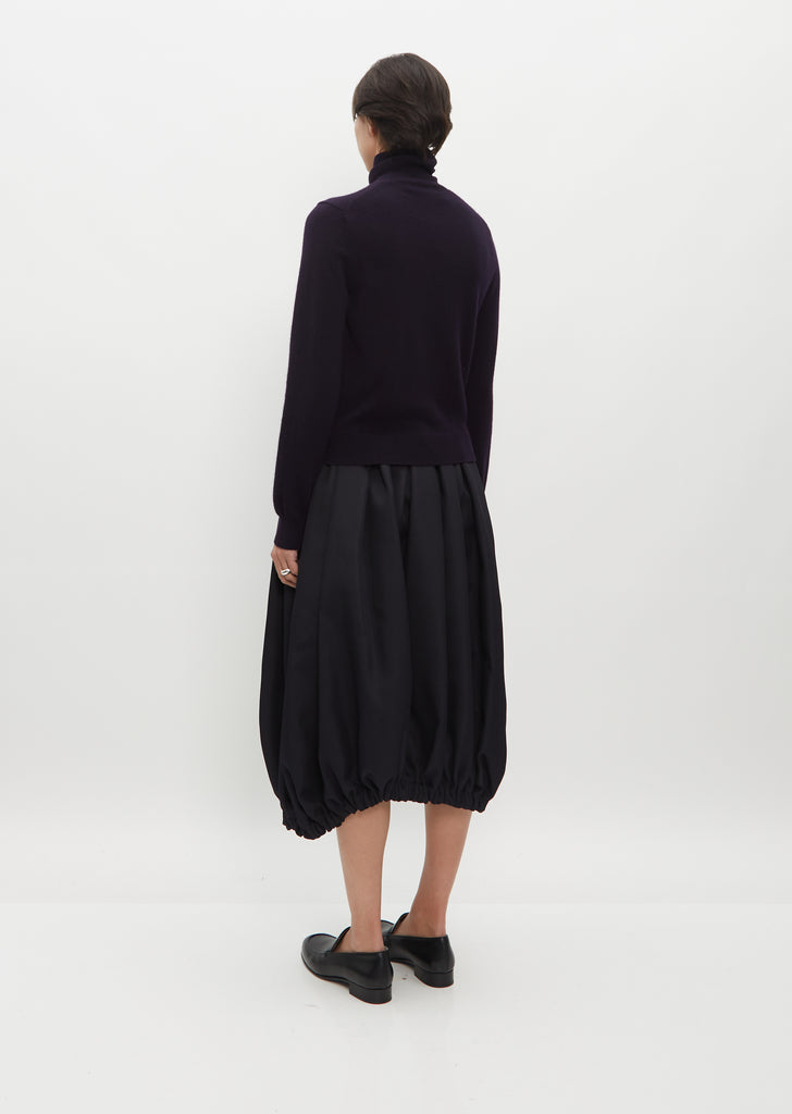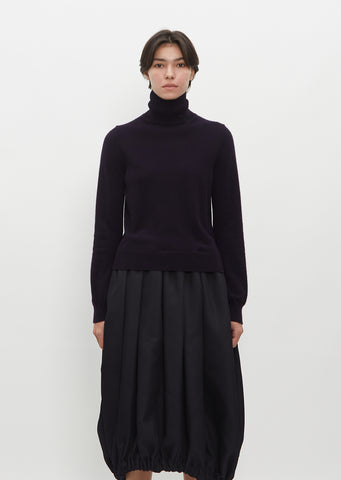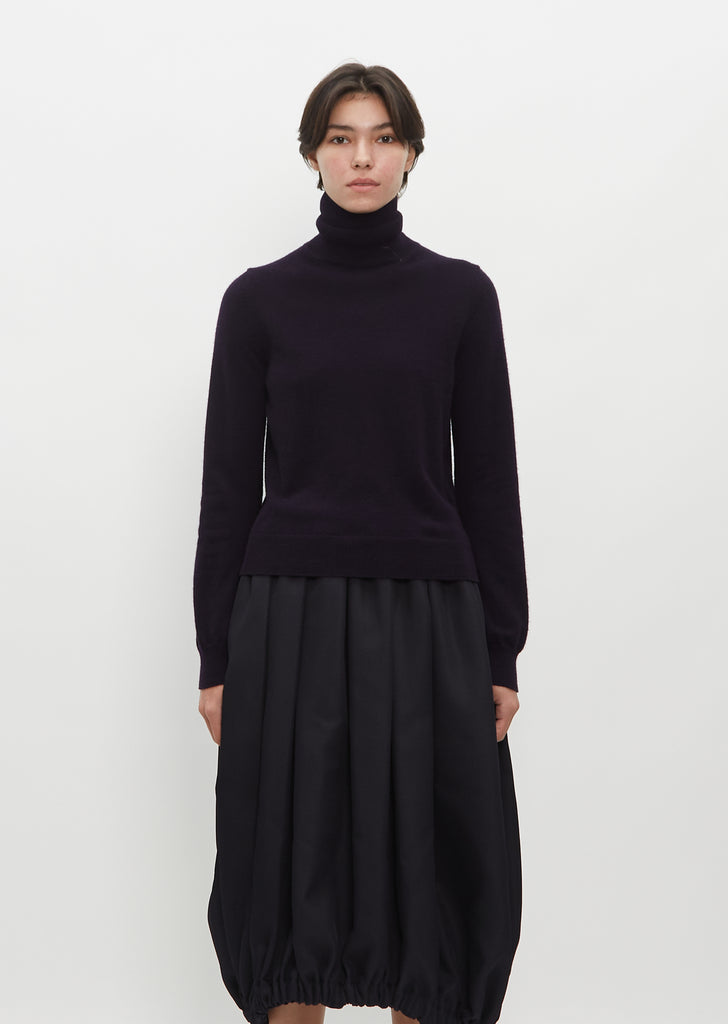Comme des Garçons navy classic fit sweater with a fold over turtleneck knit in pure cashmere. Finished with rib trim along neck, cuffs, and hem.