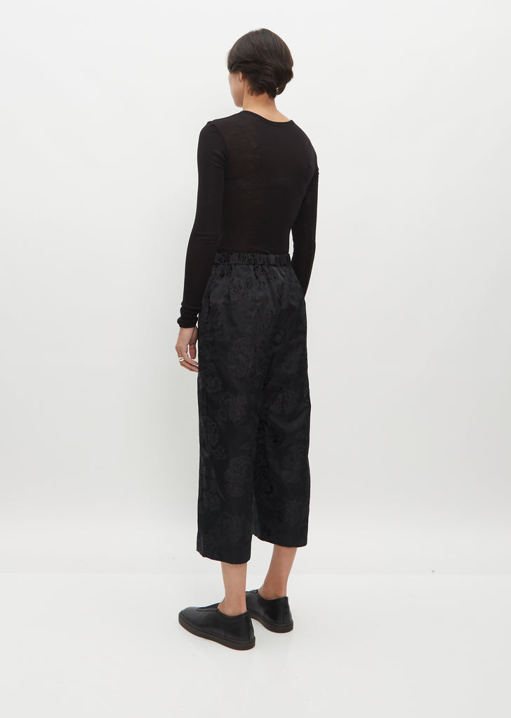 Comme des Garçons black cropped pant with a straight leg and elasticized waist in jacquard floral fabric. Finished with concealed side seam pockets. Pull on fit.