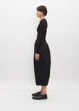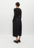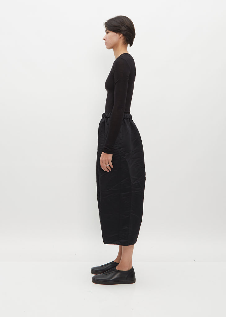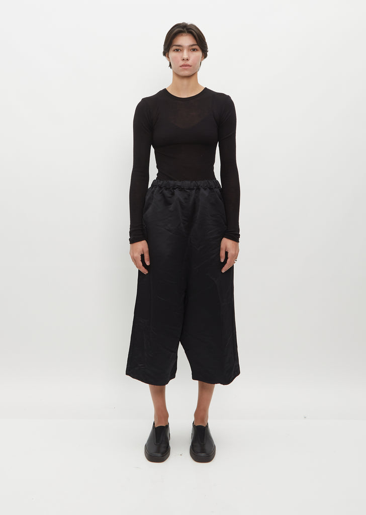 Comme des Garçons black cropped pants with a wide leg and long rise in crinkle textured satin. Features concealed side seam pockets and an elasticized waist with interior drawcords to adjust the fit. This pant is unlined. Pull on fit.