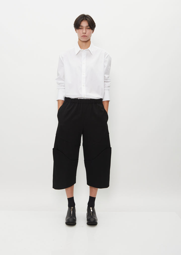 Comme des Garçons black cropped wide leg pants with split construction detail in smooth suiting wool. Features curved seam breaks around the knee with unfinished edges, concealed side seam pockets and an elasticized waistband. Pull on fit.
