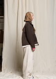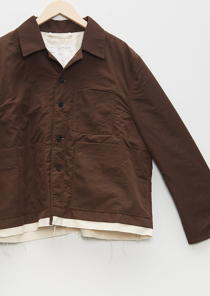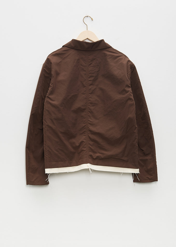 Camiel Fortgens brown oversized workwear style jacket with a spread collar in smooth technical fabric with contrasting canvas hem. Features hip patch pockets, single chest patch pocket and y neckline stitched placket. Finished with undone stitching details, tonal buttons and tonal topstitching. This jacket is fully lined in off white canvas.