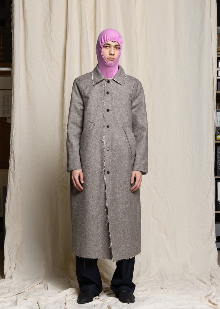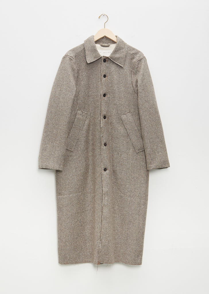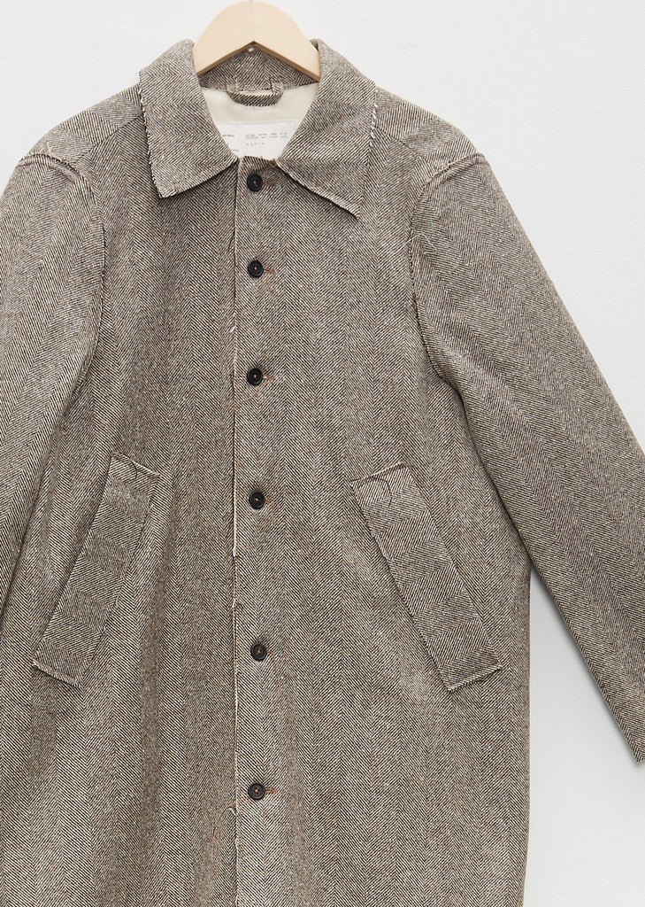 Camiel Fortgens brown long single breasted coat with a spread collar in herringbone wool. Features welt seamed side pockets, unfinished lining trim details and dark brown buttons. This coat is fully lined in contrast off white cotton.
