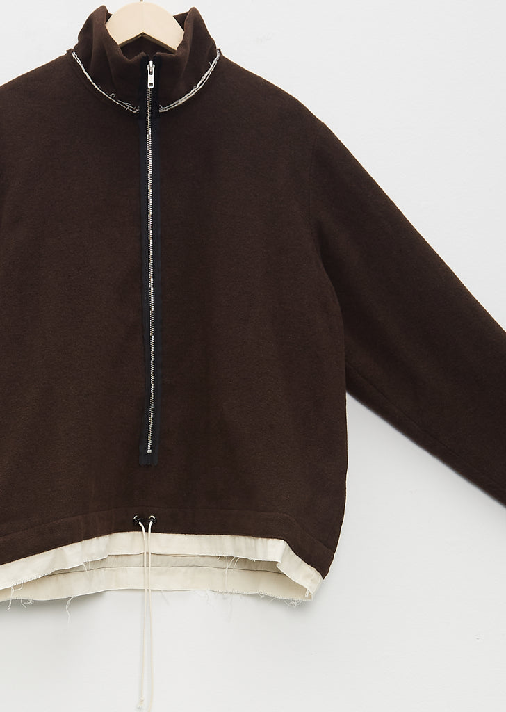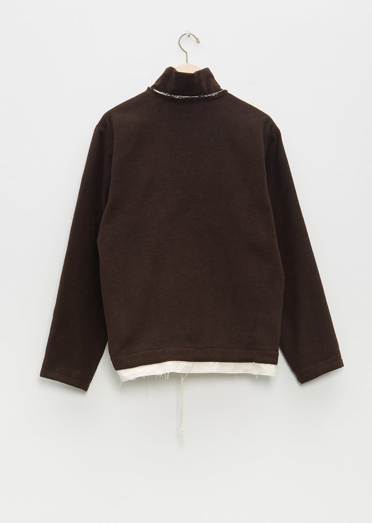 Camiel Fortgens brown zip front pull over with a high collar and adjustable toggle drawstring hem in wool fleece. Features a contrast off white cotton broadcloth hem, exposed silver toned front zip with black trim and layered unfinished seams. Fully lined in soft cotton broadcloth.