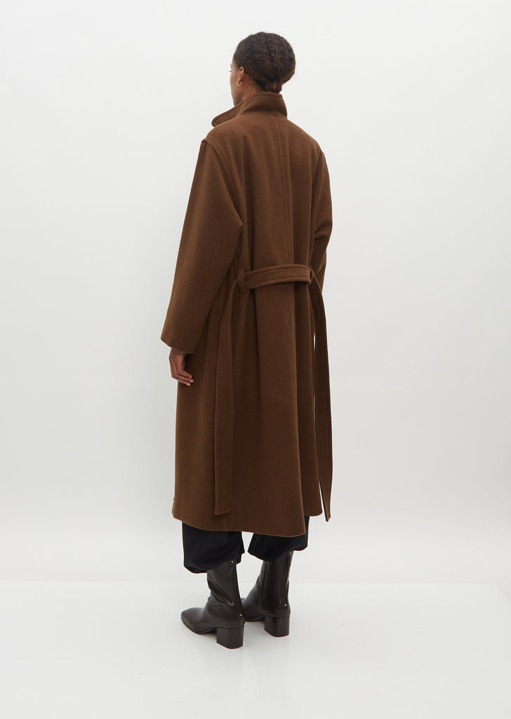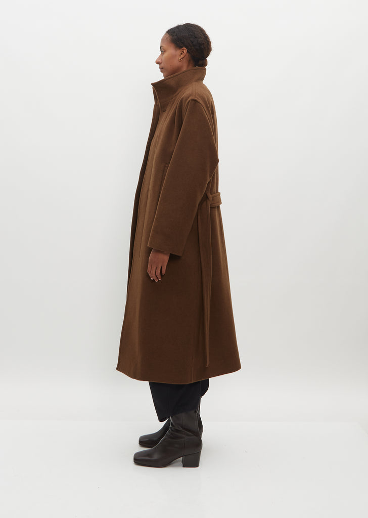 Lemaire dark tobacco unisex coat with a self waist tie in wool cashmere blend. Features a high neck, welt side pockets, and concealed placket with two exposed buttons at top.