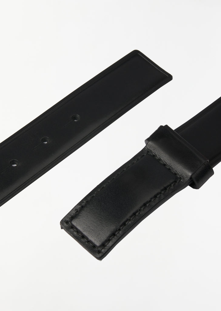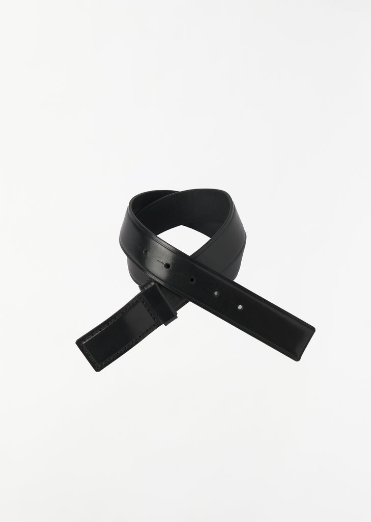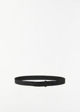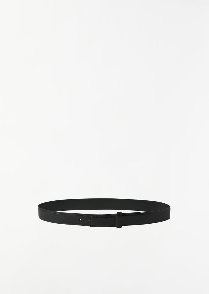 Lemaire belt crafted in black vegetable tanned leather. Features a minimalistic design, topstitching detail, and vertical tonal hardware buckle. Offered in three different lengths.