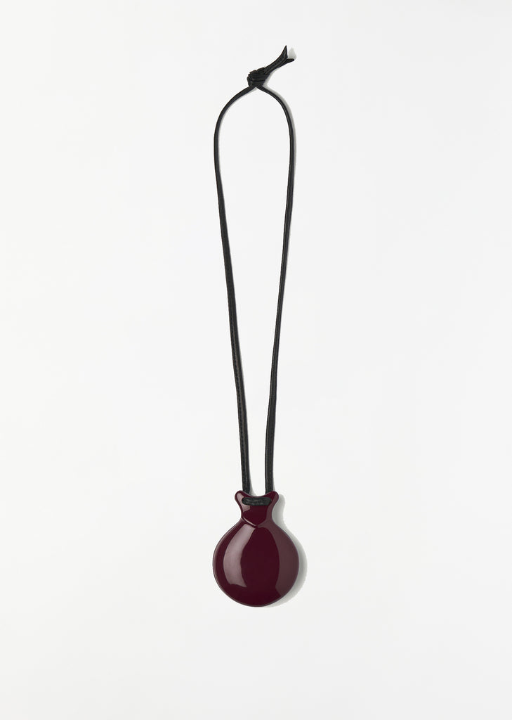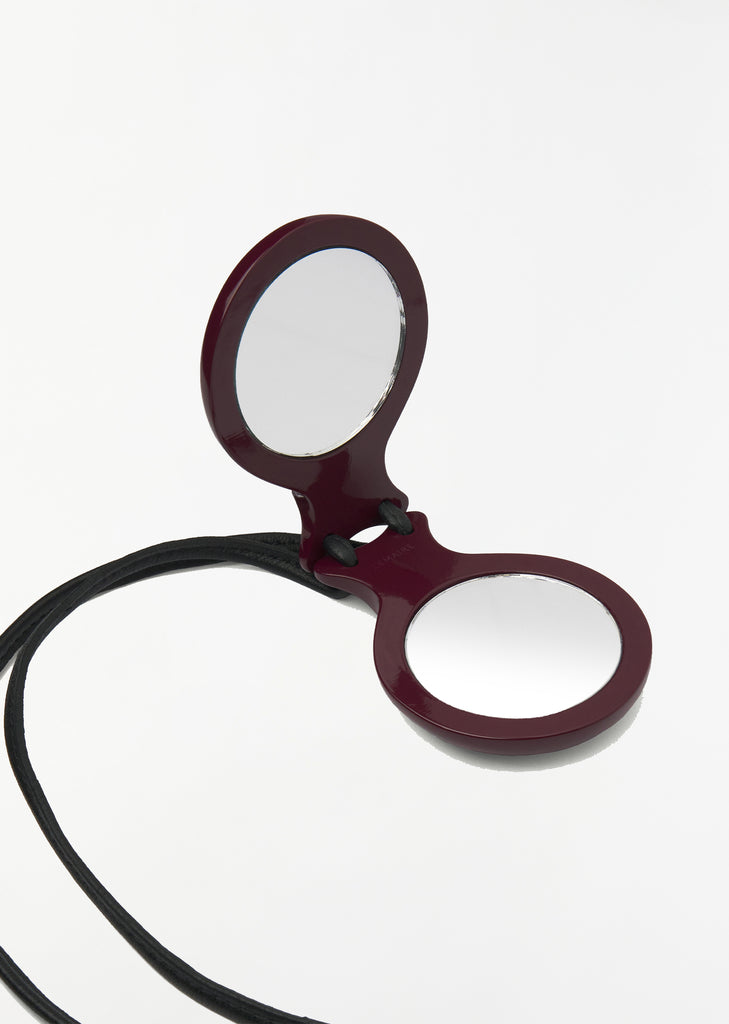 Lemaire unisex accessory composed of lacquered resin ‘castanets’ that take after the handheld instruments traditionally played by flamenco dancers. Each side encloses a mirror one classic, one enlarging and are held together by a knotted nappa leather neck cord.
