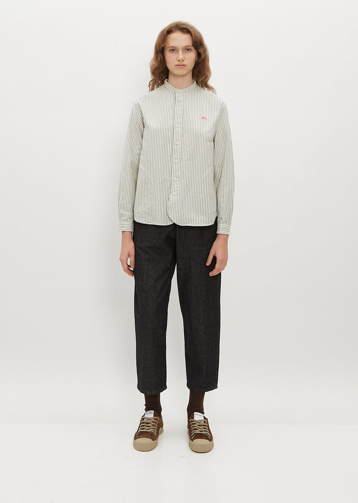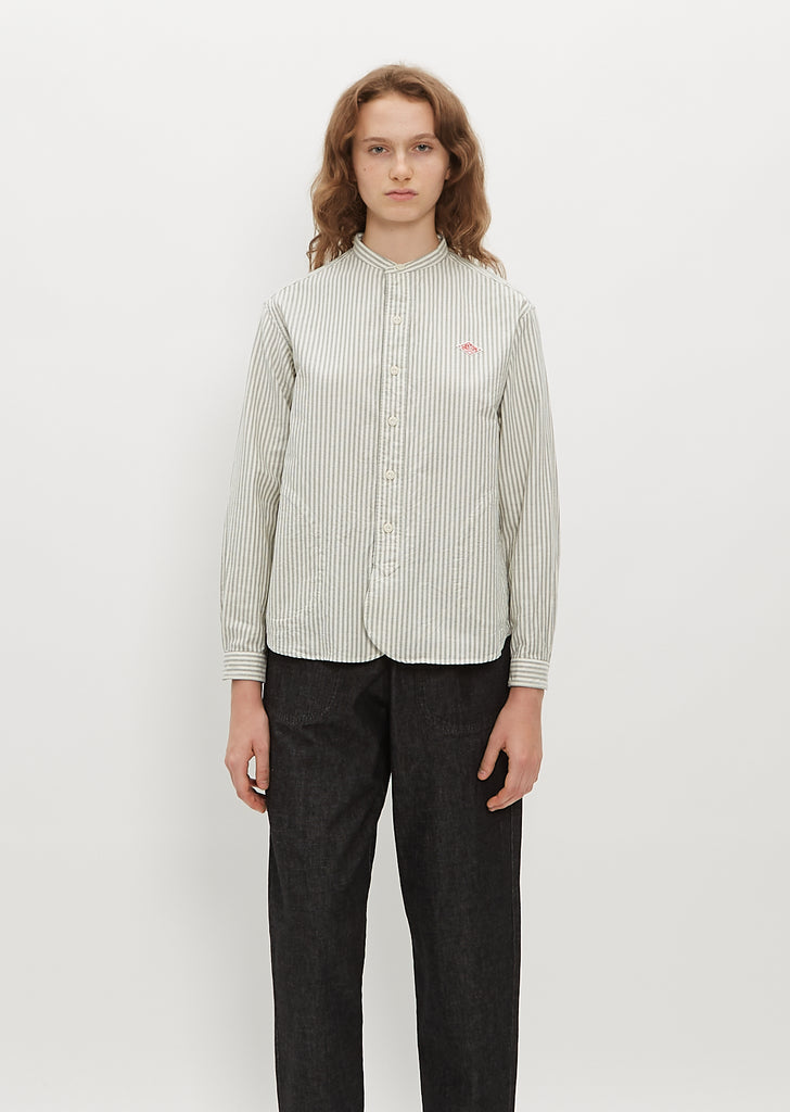 Danton band collar button-down shirt with embroidered Danton logo at the chest in a olive green cotton twill. Features dropped shoulders, gathered sleeve cuff with single button closure and back yoke with pleating.