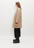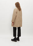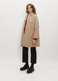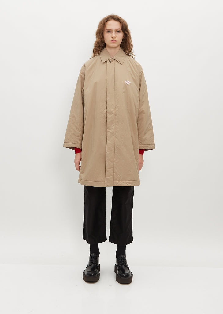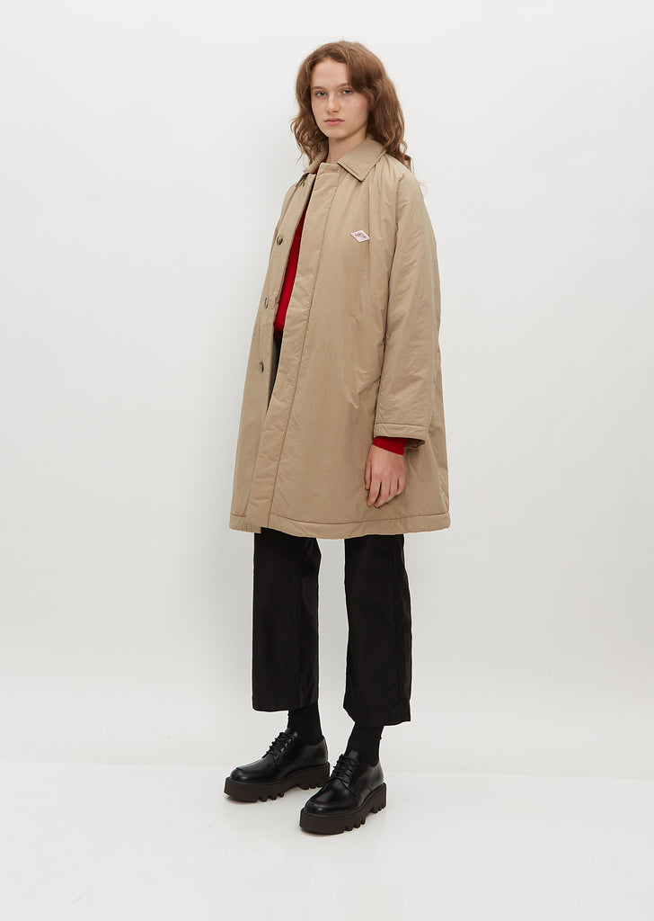 Danton beige single breasted lightly padded coat in technical nylon. Features a spread collar, signature brand chest logo, welt side pockets and concealed button front placket with single exposed button at collar. This jacket is fully lined.