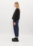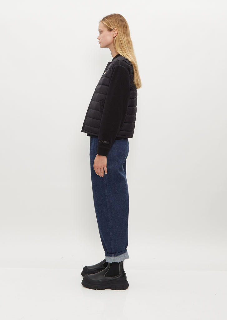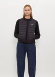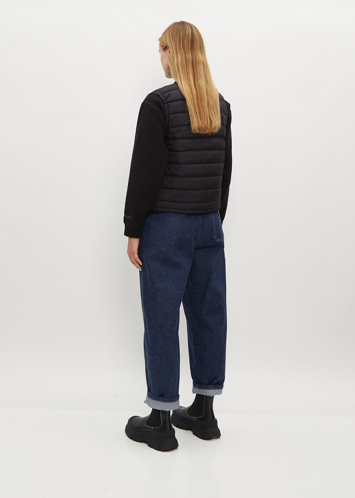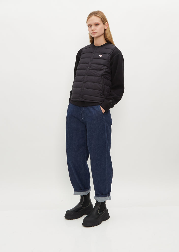 Danton crewneck puffer vest with embroidered Danton logo patch at chest in a black lightweight nylon, filled with feather down. Features tonal snap closures, front zip pockets and a small travel pouch. Fully lined in self.