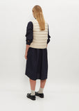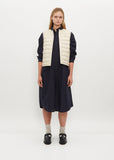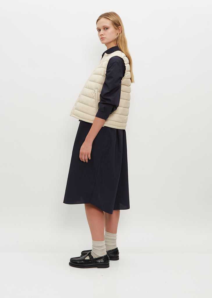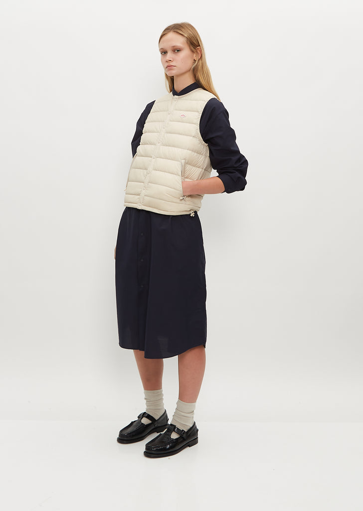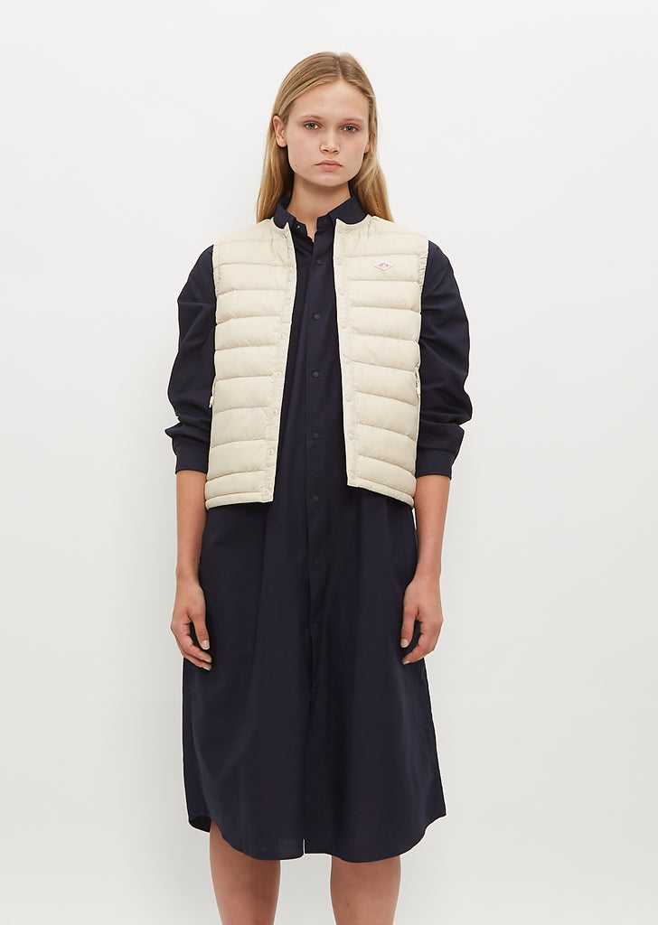 Danton crewneck puffer vest with embroidered Danton logo patch at chest in a oyster white lightweight nylon, filled with feather down. Features tonal snap closures, front zip pockets and a small travel pouch. Fully lined in self.
