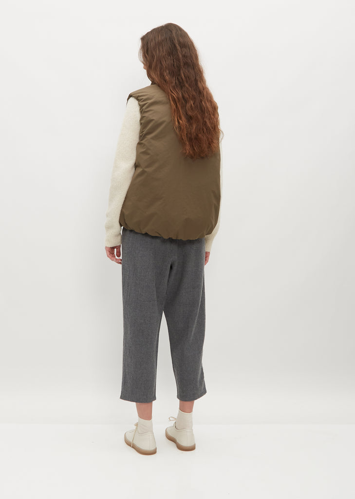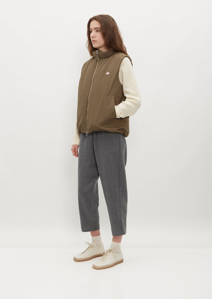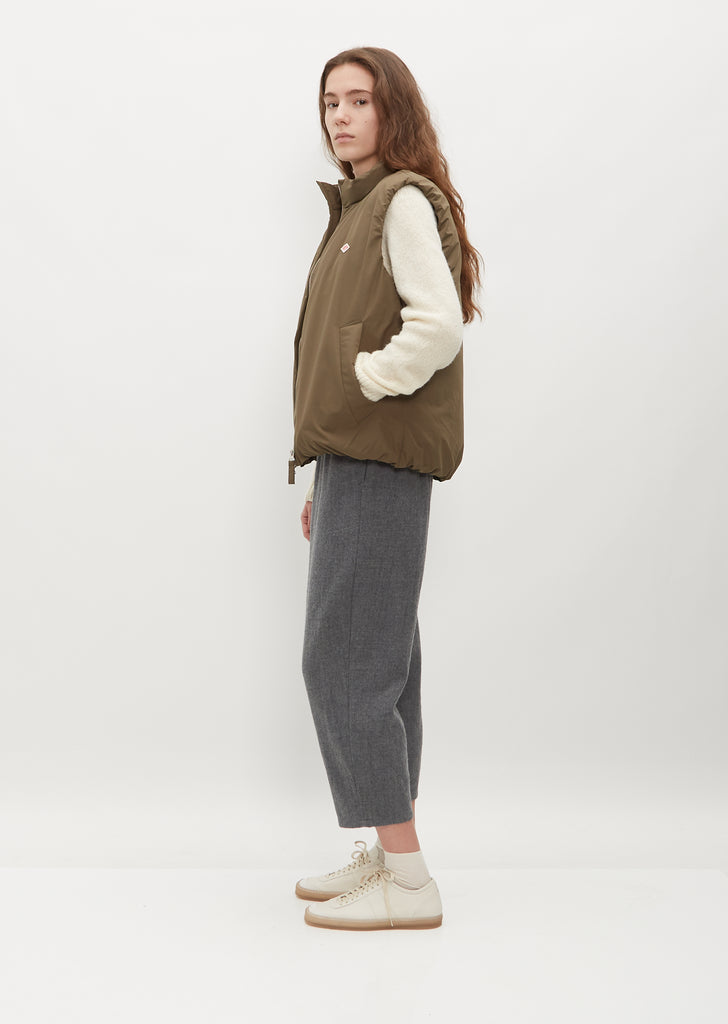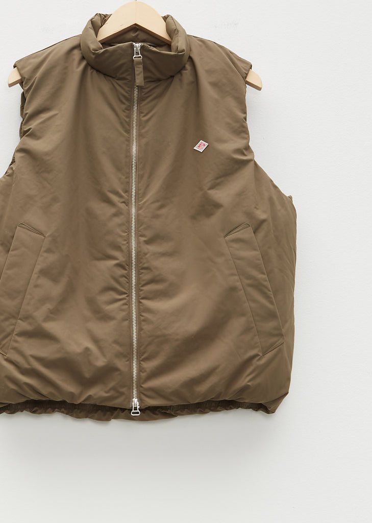 Danton olive green unisex down filled zip front vest with stand collar with in technical fabric. Boxy silhouette with a regular fit.