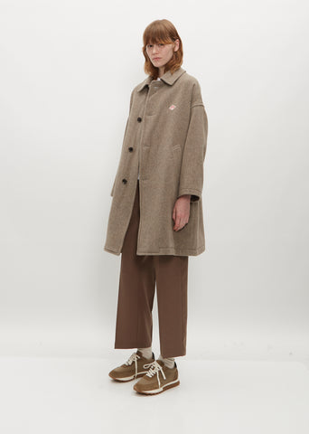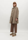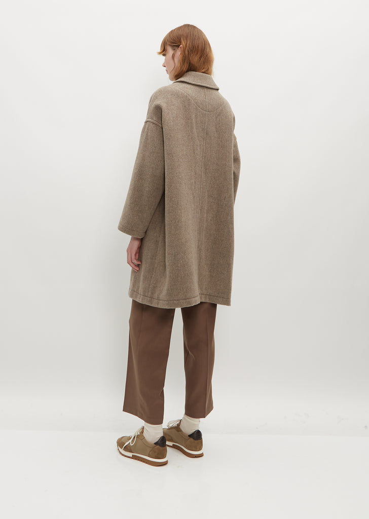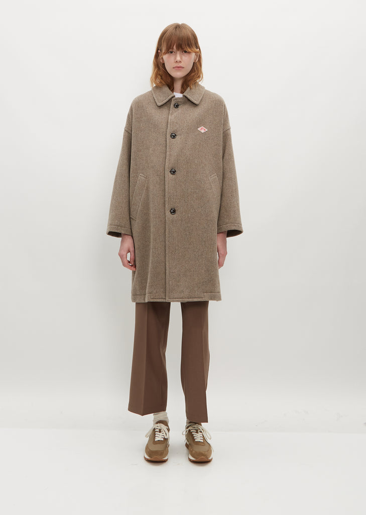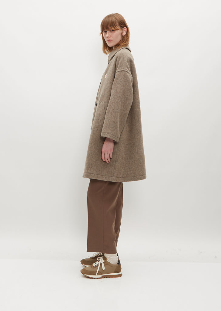 Danton dark beige single breasted coat in brushed wool pile. Boxy silhouette with relaxed fit.