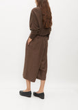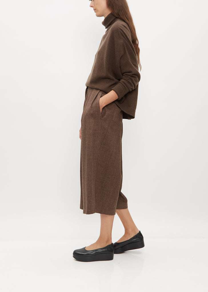Dušan brown cropped pants with a loose, wide leg in herringbone crepe. Features a single front pleat, clean front waistband with an elasticized back, side slip pockets, and back patch pockets. Finished with a concealed zip fly and single button at top.