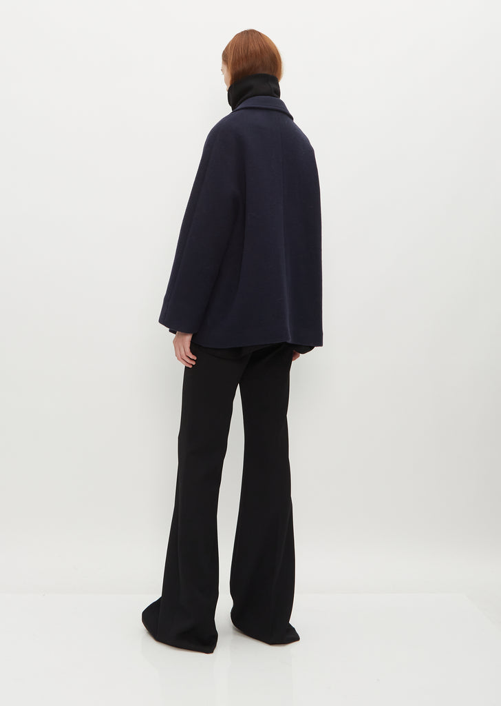 Dušan navy double breasted jacket with an oversized fit in virgin wool. Features wide notched lapels, welt side pockets, and four button closure. This jacket is unlined.