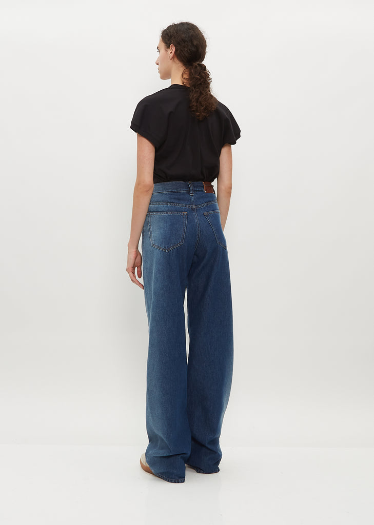 Dries Van Noten indigo wide leg jeans with a high-rise fit in cotton denim. 5 pocket styling. Button fly fastening. Relaxed fit. Long inseam.