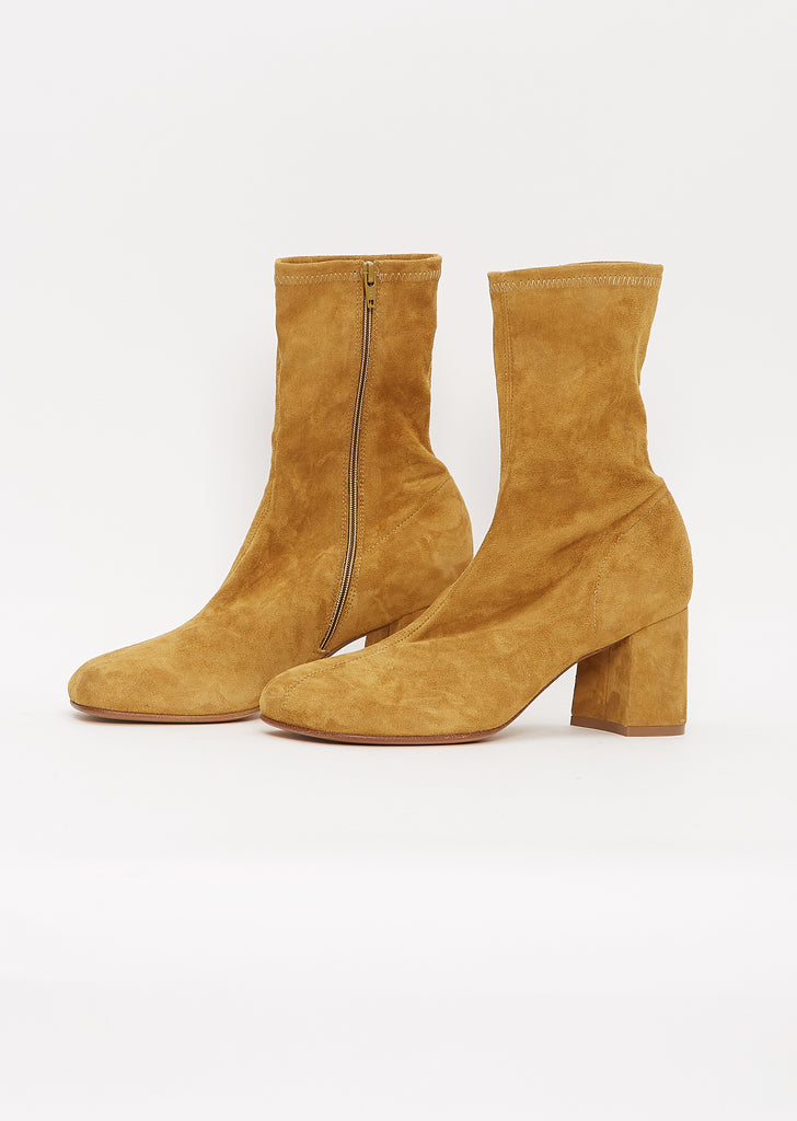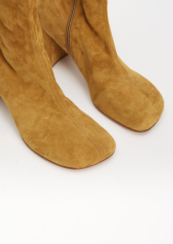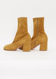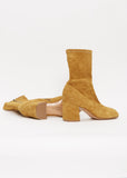 Dries Van Noten mustard angled square toe glove fit ankle boot with suede leather-wrapped block heel and center seam in soft suede leather. Fully lined in tonal reversed leather and set on a tonal leather sole. Finished with an inner side zip closure.