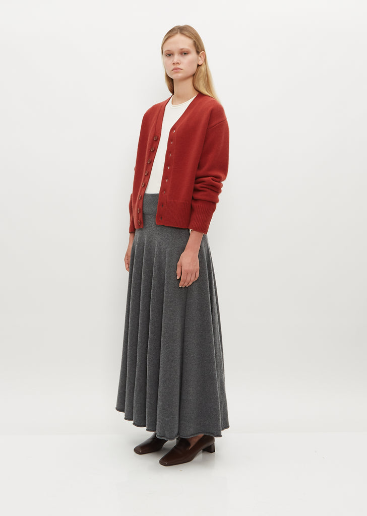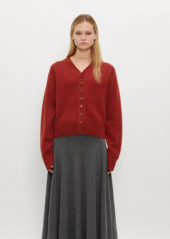 Extreme Cashmere brick cardigan with buttons in soft heavy knit cashmere. Features a classic v-neck and voluminous sleeves.