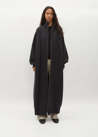 Extreme Cashmere oversized coat in luxurious cashmere jacquard knit. Features a high collar, pockets on each side and a zipper that opens both ways.