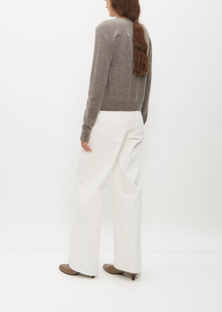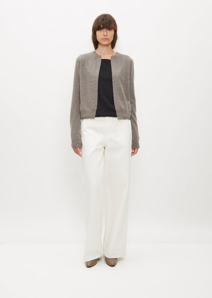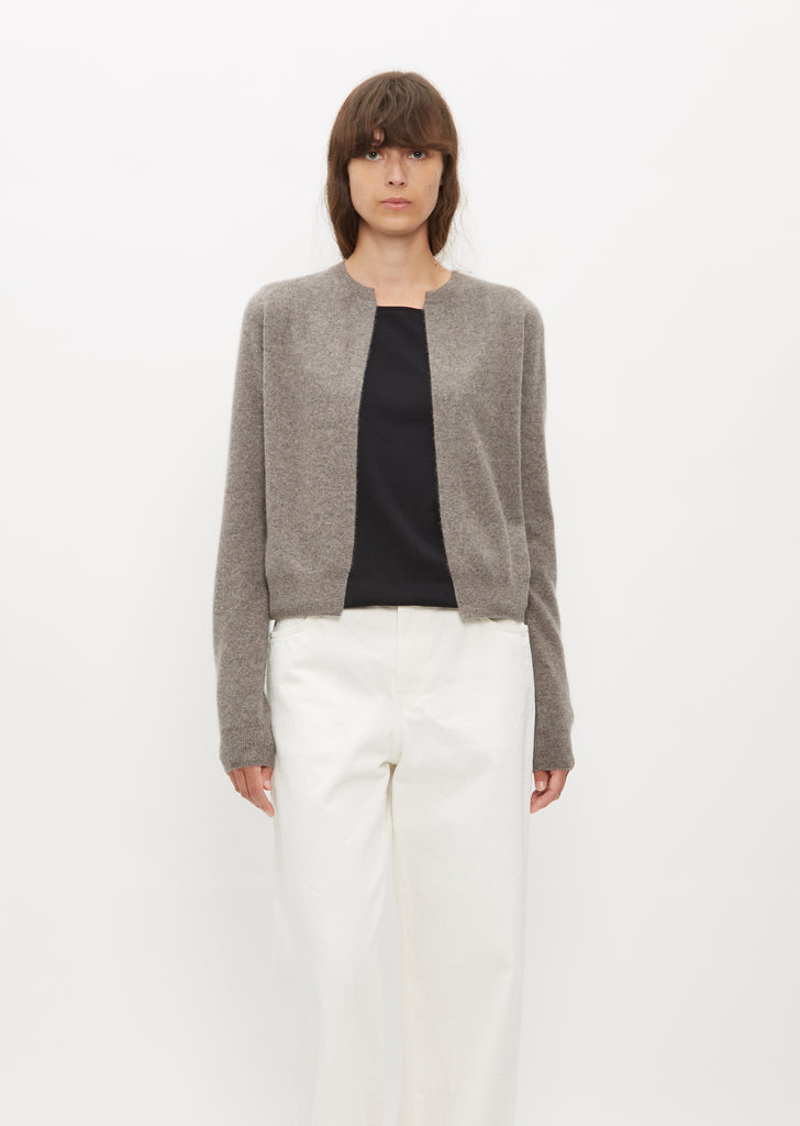 Frenckenberger melange open-front cardigan with a round neckline in an ultra-soft medium weight 100% cashmere knit. Features a slightly cropped, fitted silhouette and continuous rib trim finishing.