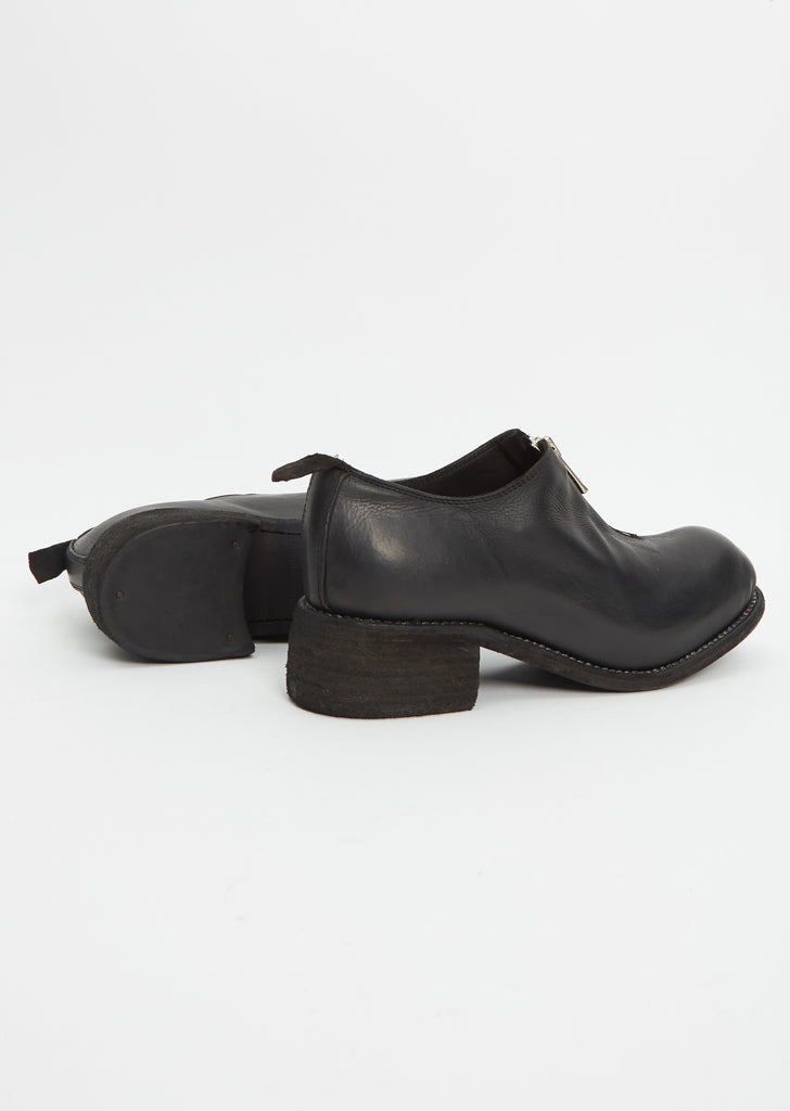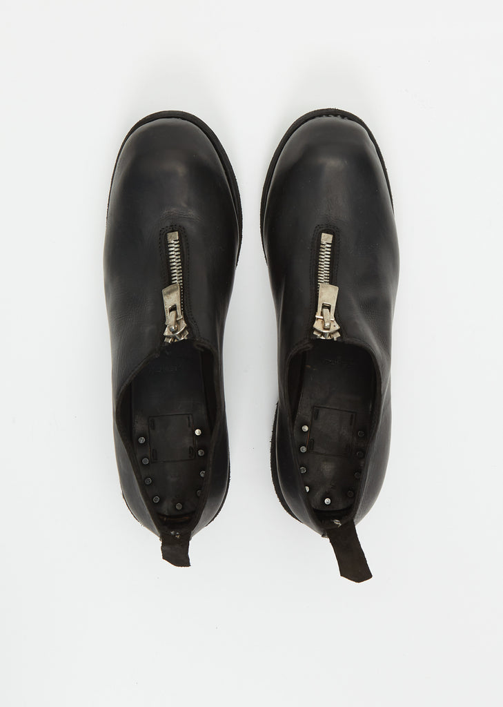 Guidi black low cut front-zip ankle boot with a back loop pull handcrafted in full grain calf leather. Fully lined in tonal leather with a hammered stacked heel.