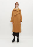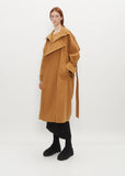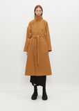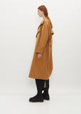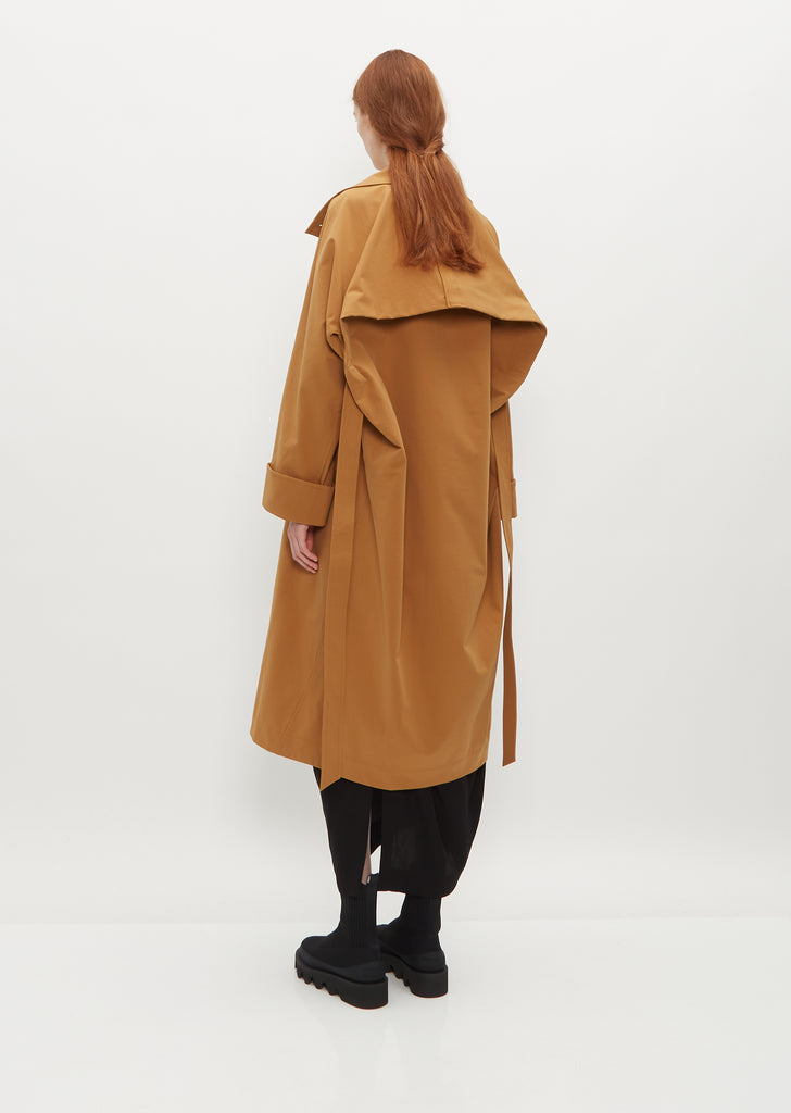 Issey Miyake brown long double breasted trench coat with a tall neckline made from a special structured polyester yarn with a light and stretchy hand and soft, lustrous texture. Features a self belt, raglan sleeves, wide turned up cuffs, and concealed side pockets. Finished with tonal buttons.
