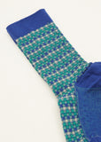 Issey Miyake blue ankle socks with a square grid pattern in a cotton blend. Finished with solid blue reinforced toe, heel and top.