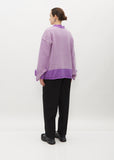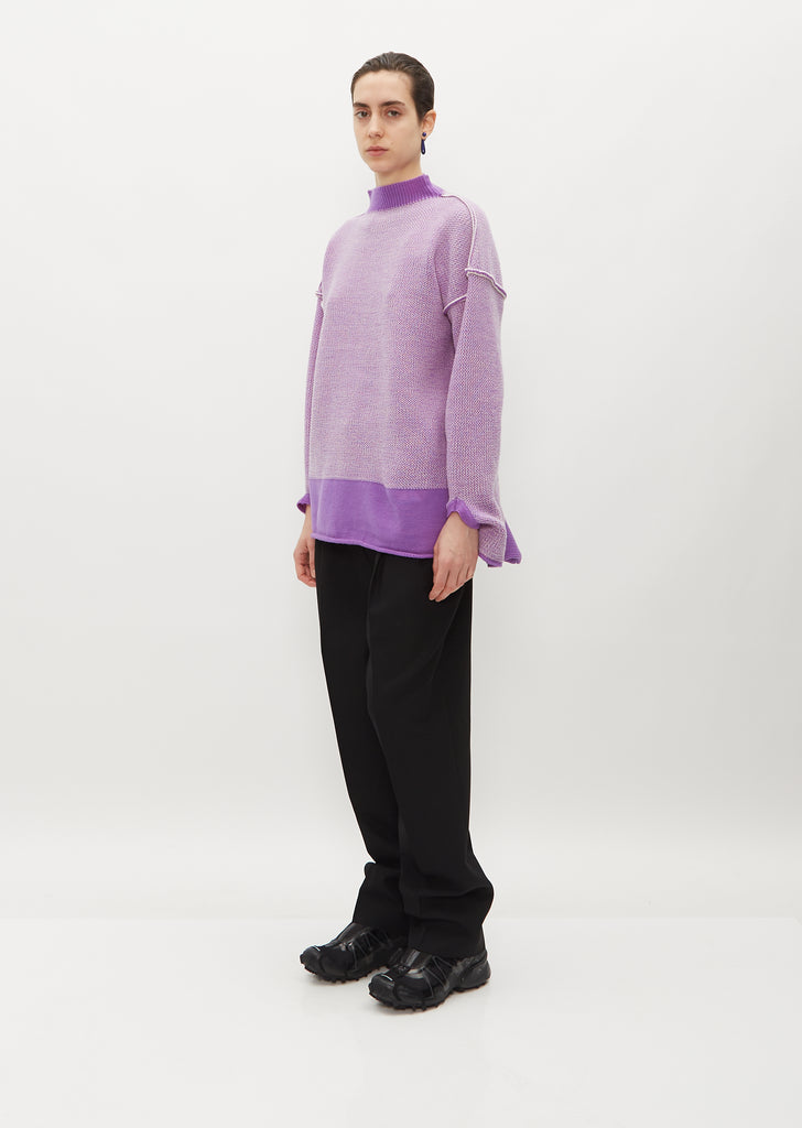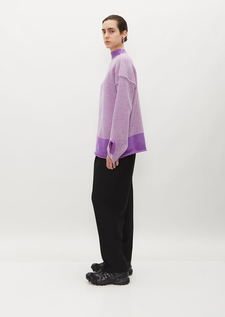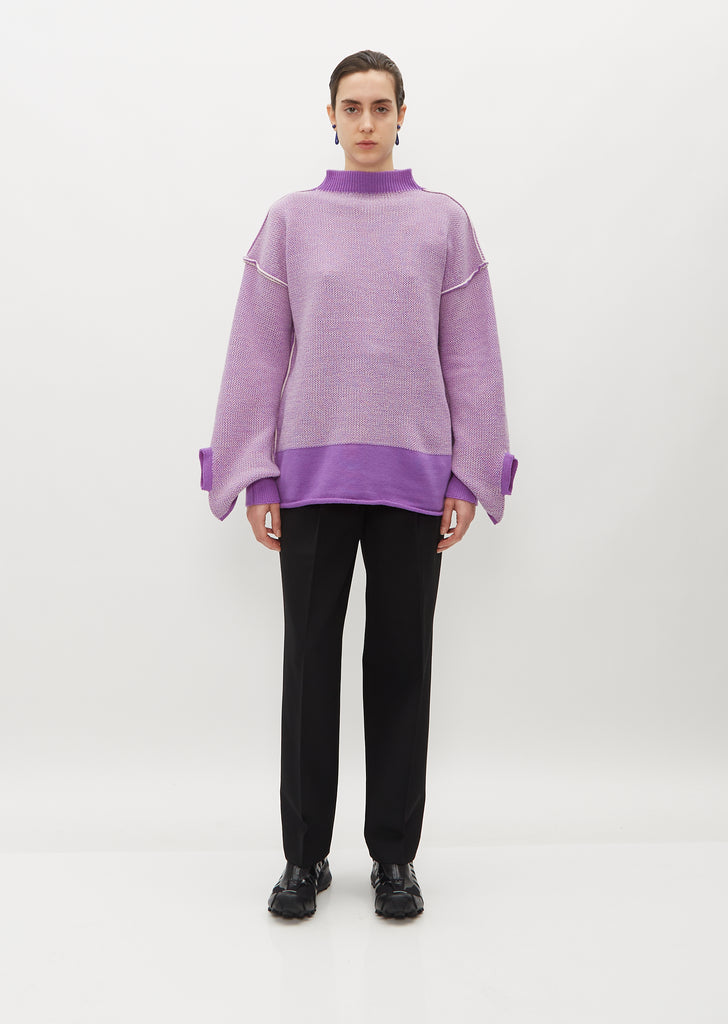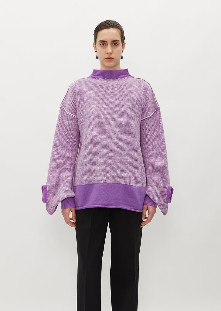 Issey Miyake light purple oversized sweater with a draped balloon sleeves knit in pure wool. Detailed with a a mock neckline, dropped shoulders and contrast white trim along the collar, cuff and hem.